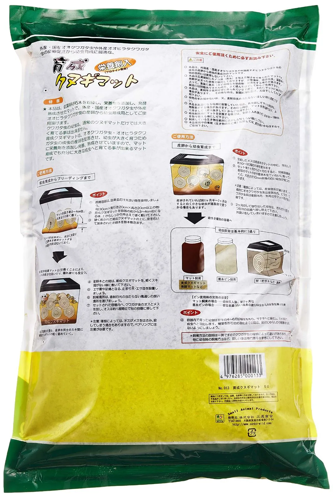 広葉樹材朽木を粉砕し栄養剤「プロテイン配合」を添加し、発酵熟成させ、外産、国産オオクワガタやオオヒラタクワガタ虫の産卵から幼虫育成用として作られた本格的なクワガタ虫専用のマットです。
