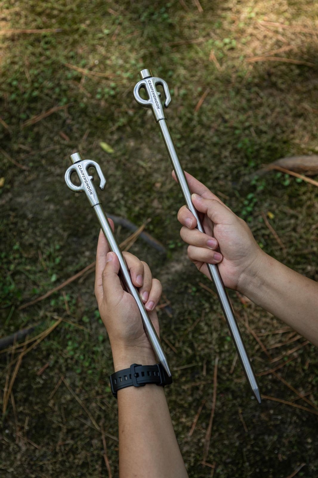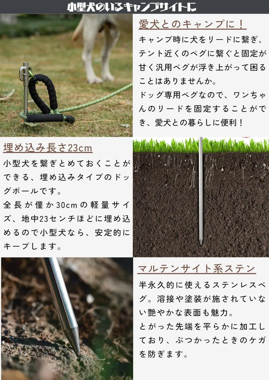 しっかりしたつくりのステンレス製係留具。 ペグは回転するので、ワンちゃんのリードが絡まりません。愛犬とのキャンプやお散歩に! ポールや木がない際に役に立つ、リードの係留用アンカー。