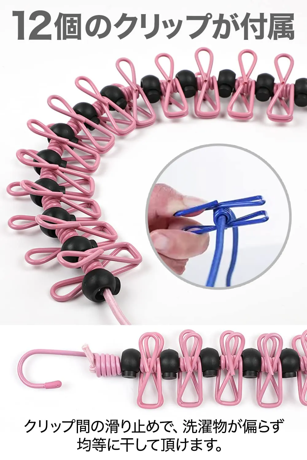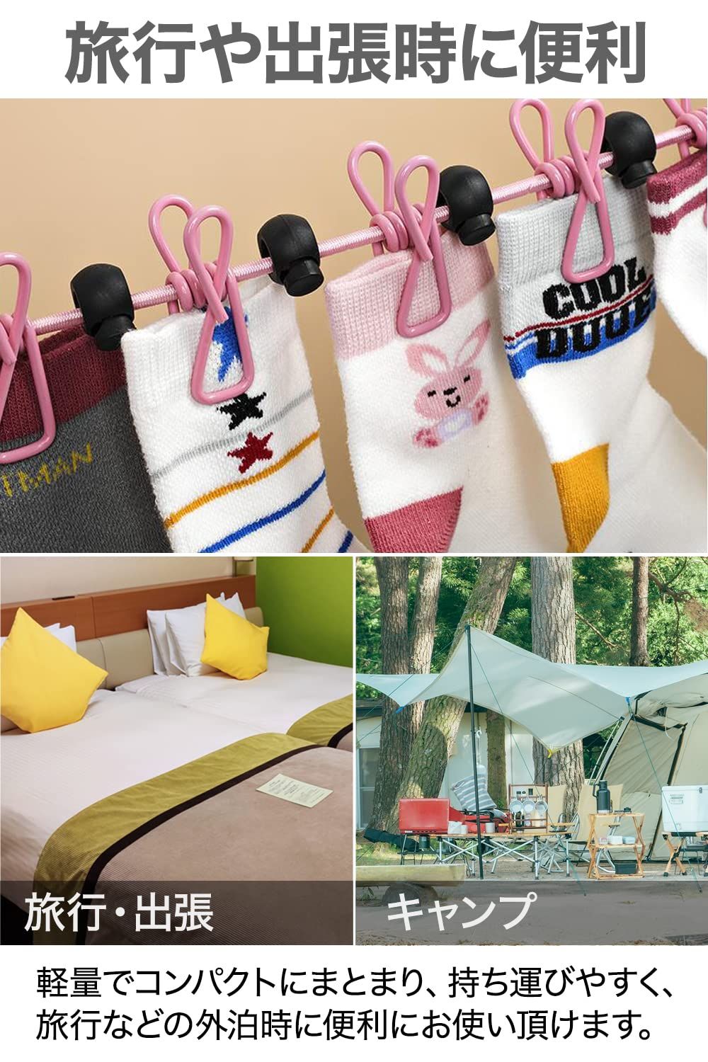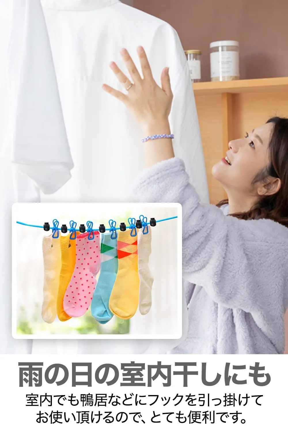 ・旅行や出張時の外泊中に洗濯物を室内で干すためのロープです。・旅行以外にも雨の日の室内干しにも役立ちます!・12個クリップが付属しておりますので、靴下や下着等も干していただけます。・購入日から30日間の返金保証がありますので安心してお買い求めください。