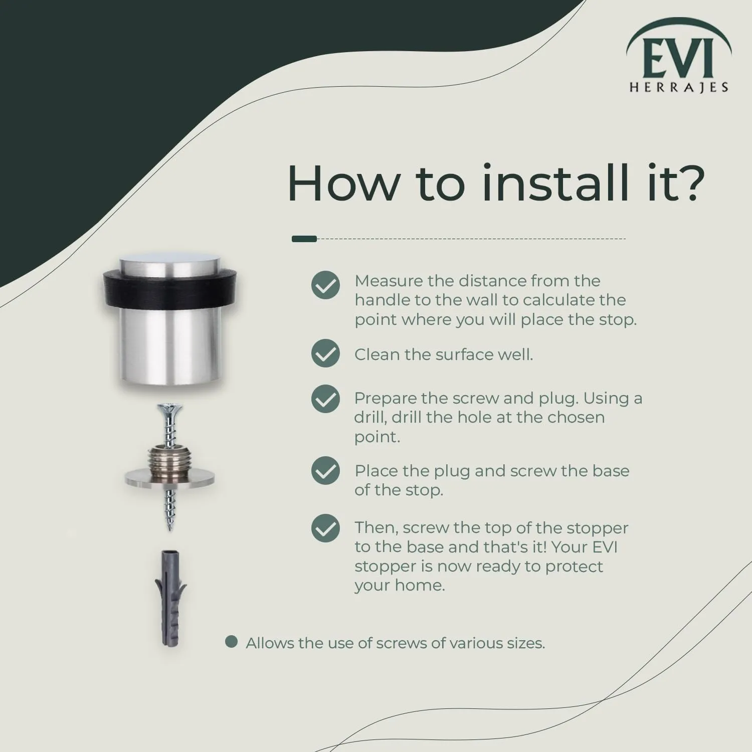 品質とサービス EVIは、優れた品質のドアストップを設計・製造してきた長い歴史を持つヨーロッパのメーカーです。製造からカスタマーサービスに至るまで、細部にまで気を配っています。