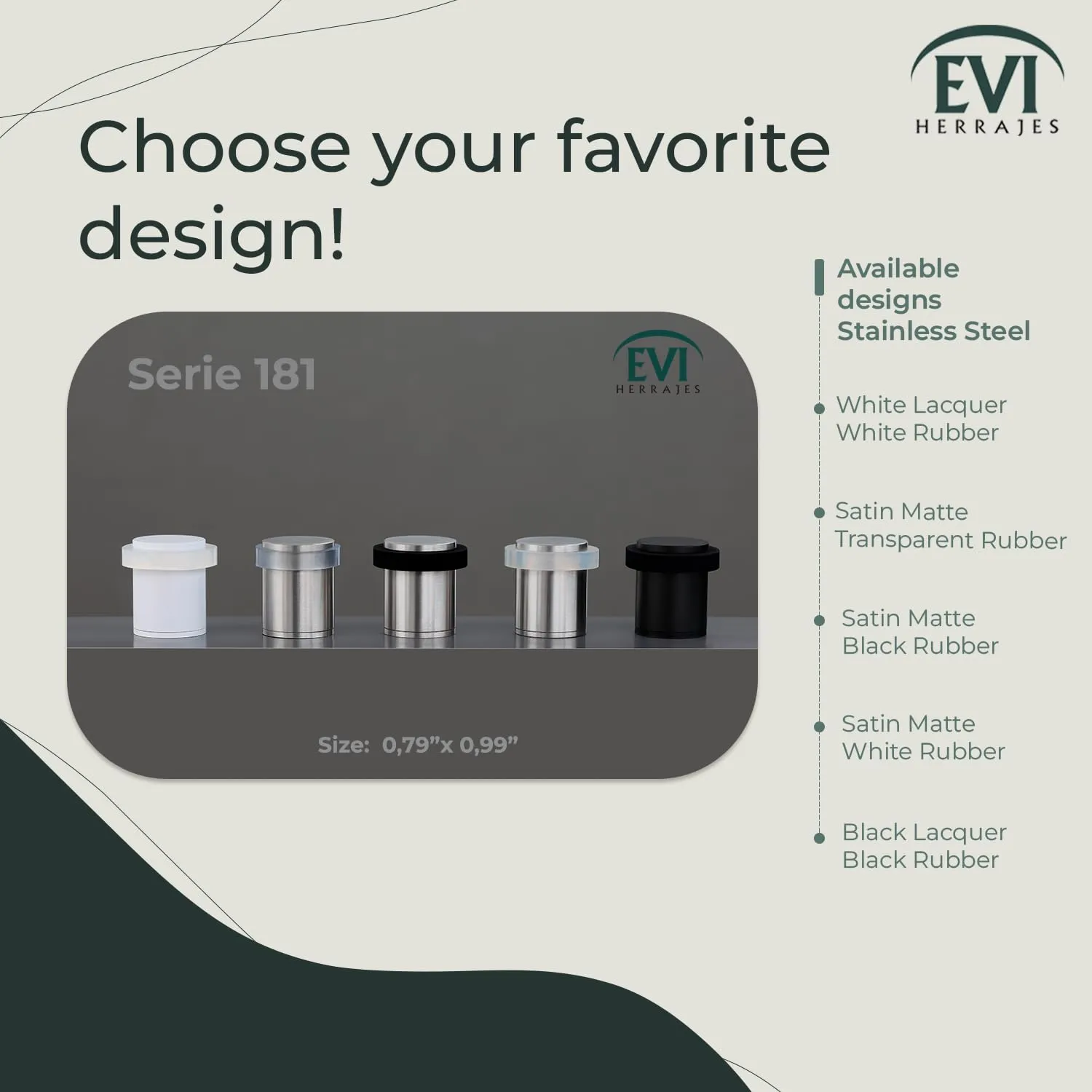デザイン:EVIデザインのデコラティブなドアストッパーでコーナーを飾りましょう。100%機能的。20x25 mmのデコラティブトップ、ブラックラバー、マット仕上げ。