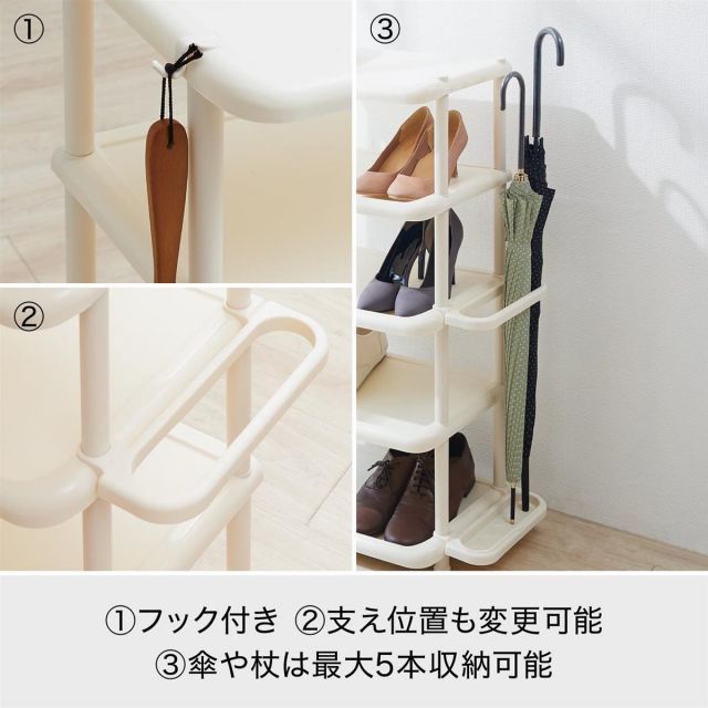 ◆商品名:ライクイット(like-it)靴収納シューズストレージ5段幅35.5x奥31x高87cmブラウン日本製ショートブーツ収納省スペースブーツ収納ラック傘立て付き 本体サイズ:W355×D310×H870mm 本体重量:約1.3kg 素材・材質:ポリプロピレン 生産国:日本 靴5足、傘5本収納可 靴べらなどを掛けられるフック付き フックと傘立ては左右どちらにも取り付け可能 傘の水受けは取り外し可能 省スペースで効率よく収納 幅355mmのスペースに靴5足と傘5本を収納可能靴べらやブラシなどがかけられるフック付き。フック、傘立ての位置は左右どちらでもOK傘立ての水受け皿は取り外せるのでお手入れも簡単 商品番号:20260402070455_168