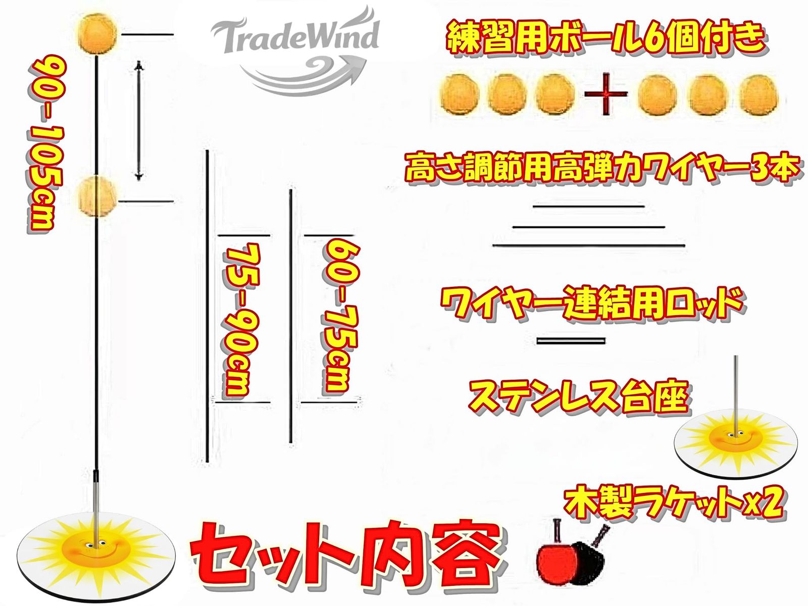 【セット内容&新デザイン】 木製ラケット×2、専用ピンポン球×6、高弾性ワイヤ×3(60〜105cm対応)、高さ調節器×1、新デザイン金属台座(サンシャイン)×1 台座部分は滑り止め加工付きで安定感抜群。シルバー台座モデルとのバリエーション展開で、お好みに合わせてお選びいただけます。