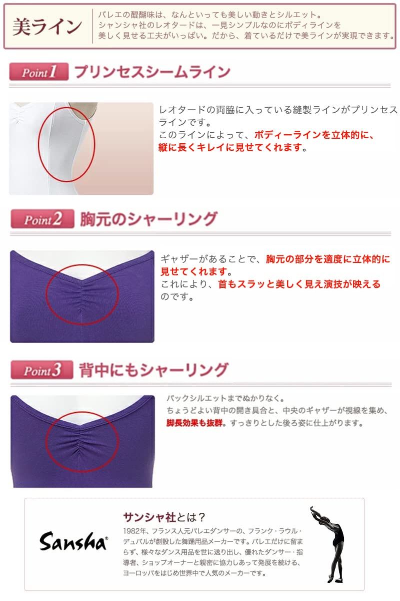 フランスの有名ダンス用品メーカーサンシャ社のキャミソールレオタードです。プリンセスシームが入っています。