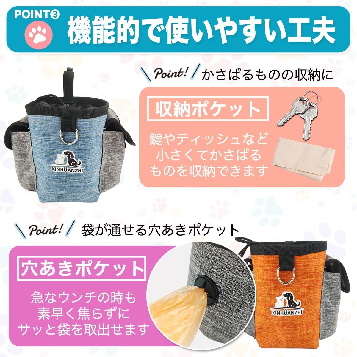 【衛生的でお手入れラクラク】 撥水性や抗菌・消臭加工が施されたトリーツポーチもあり、汚れても水洗い可能で清潔を保てます。犬のおやつを清潔に持ち運べるのは、しつけにおいても大事なポイントです。