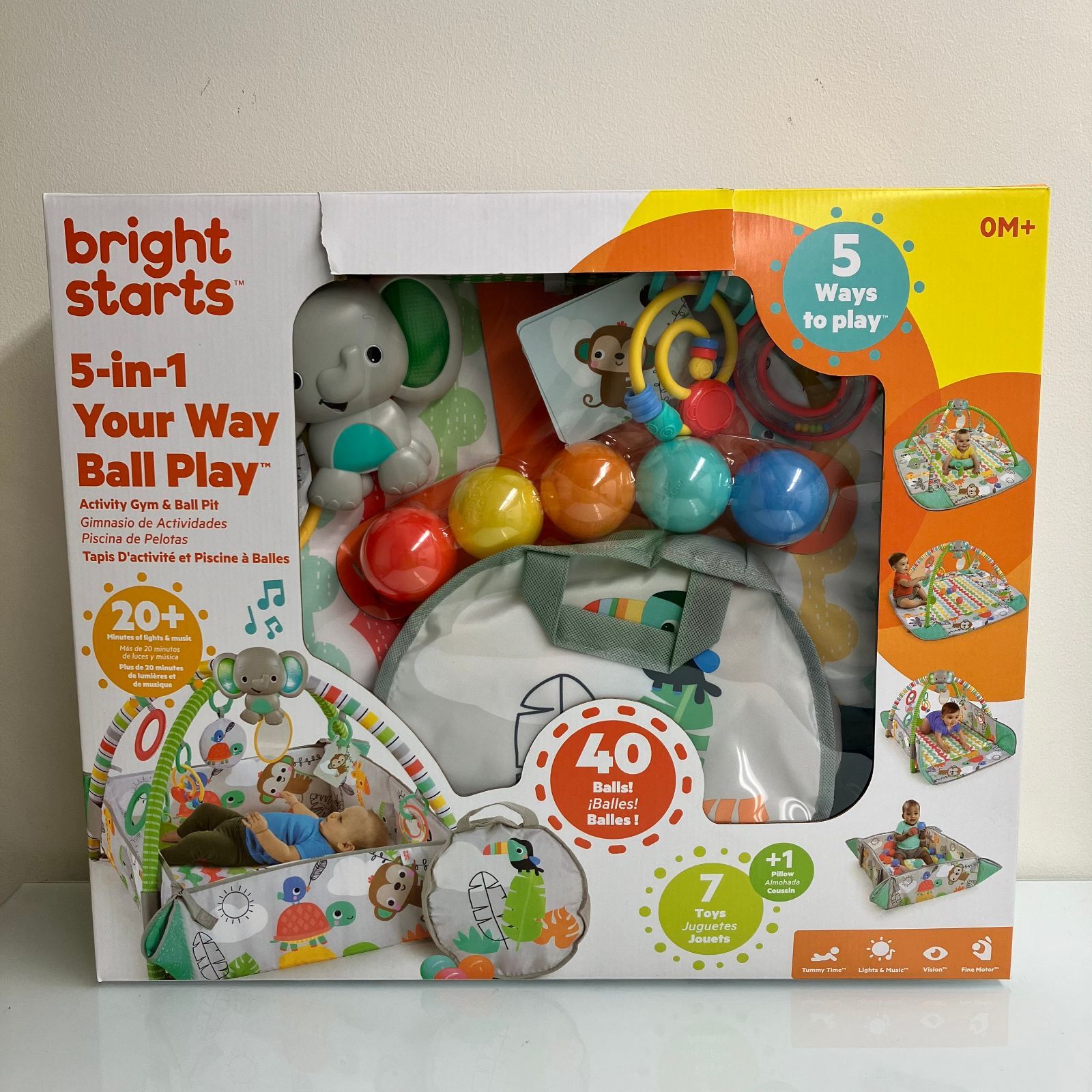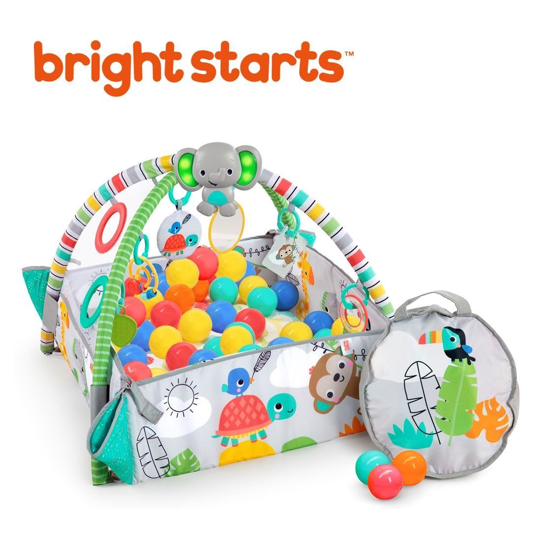 【商品説明】 赤ちゃんの成長に合わせて 形を変えて使えるプレイジム! *ボールが40個 付いているのでボールプールとしてもお使いいただけます。 *ミュージカルトイは20 分以上の自動演奏モードを搭載し、ぞうの耳の部分が光ります。 *腹ばい時に便利なまくら/ クッション付き *ジムリンクでおもちゃをつなげて楽しめます。 単3電池×3 ※別売 セット内容:プレイマット、トイバー、ぞうのミュージカルトイ、丸型おもちゃ、葉っぱ型おもちゃ、フラッシュカード×3 、インタラクティブおもちゃ、かがみ、まくら / クッション 、 ボール用バッグ、ボール×40、ラトル、ジムリンク×6 ※ 組み立てサイズ トイバー付きで広げた際:101cm x 113cm x 53cm 箱型:60cm x 64cm x 53cm 企画:アメリカ 製造:中国 パッケージ:76×10.5×51cm、1980g 素材 :PE、 PET、PP、ABS、PA、ポリエステル、ナイロン、鉄、ゴム、アクリル 対象年齢:0ヵ月~ ブライトスターツ Bright Starts キッズツー KidsⅡ 赤ちゃん ベビー ジム おもちゃ ボールプール