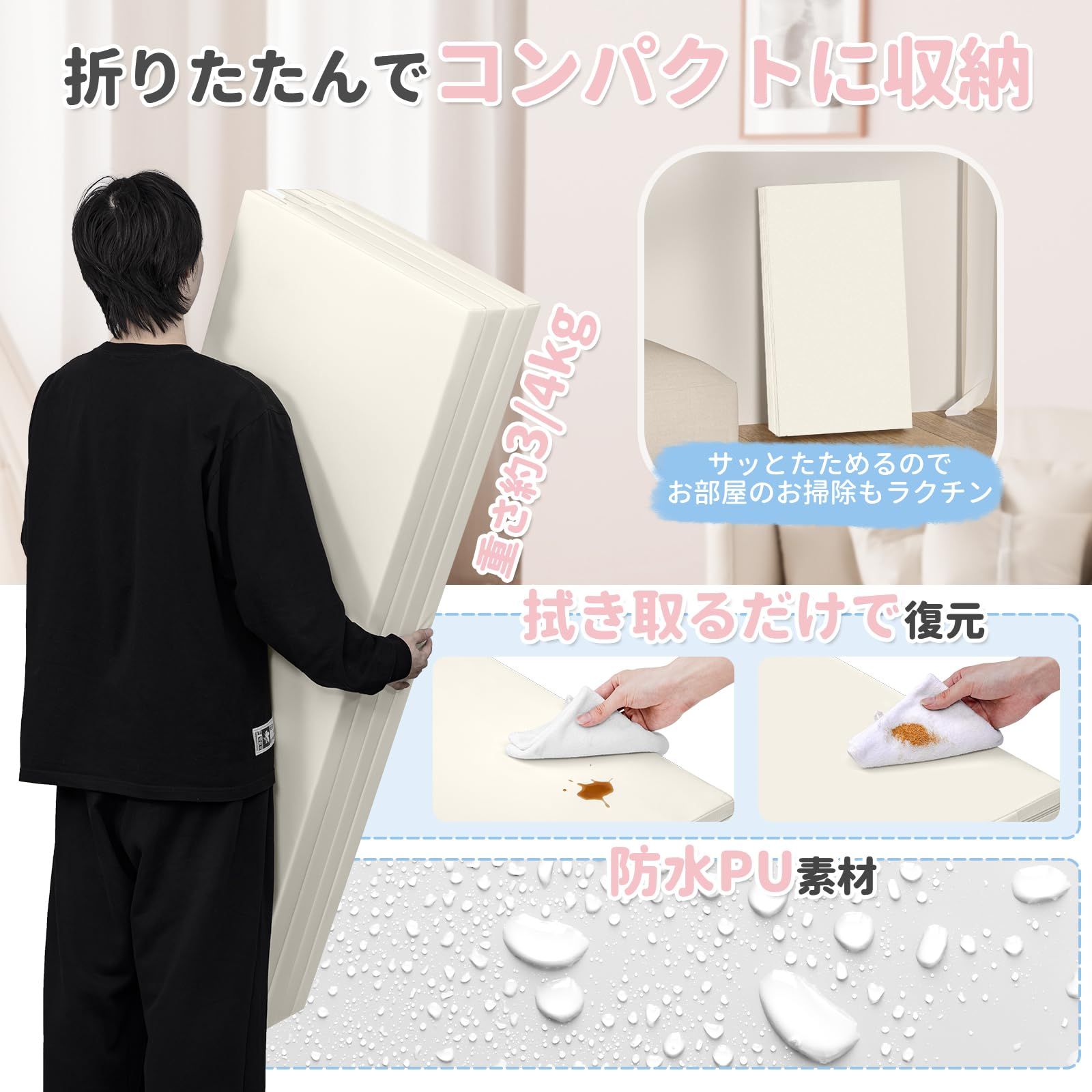 【4つ折りのシームレス・デザイン】プレイマットはシームレスなデザインを採用し、ほこりや細菌の蓄積を防ぎ、赤ちゃんがマットの継ぎ目と接触することによる不快感も軽減します。