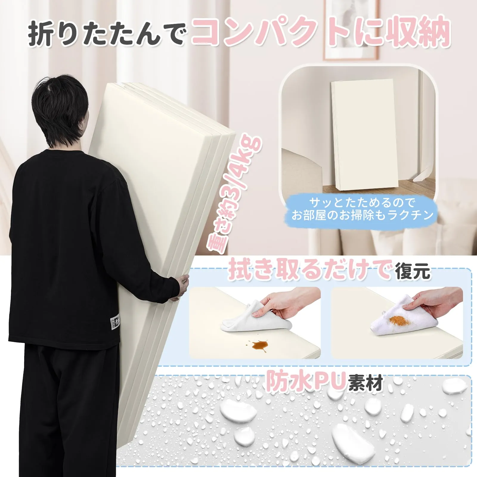 【折りたたみ式で収納が簡単】折りたたみマットは、使わないときは折りたたんで収納できるので、狭いスペースや頻繁に掃除が必要な場所に便利です。