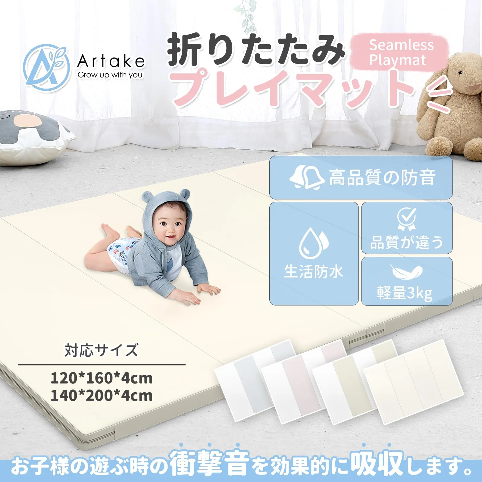 新品 プレイマット-Artake 抗菌ベビープレイマット 収納しやすい リバーシブルPUマット 床暖房対応 厚手4CM 折りたたみ 防水 防音 ノンホルム 両面使用 大判おしゃれ(140*200*4 全ベージュ)