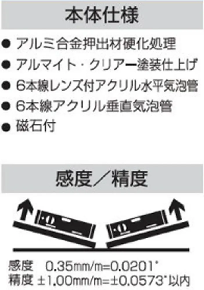 感度:0.35mm/m=0.0201°/ 精度:±1.00mm/m=±0.0573°内
