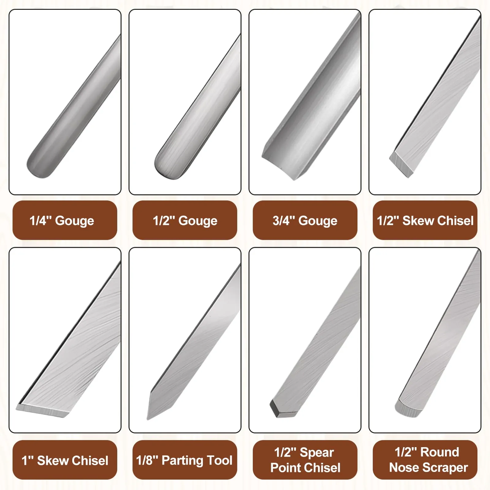パッケージの付属品:木工用旋盤のみセットには、2本のスキューノミ(1/2インチ&1インチ)、1/2インチのスピア先、1/8インチのパーティングツール、1/2インチラウンドノーズ、1/4インチガウジ、1/2インチガウジ、3/4インチガウジが含まれており、さまざまな木工プロジェクトに適しています