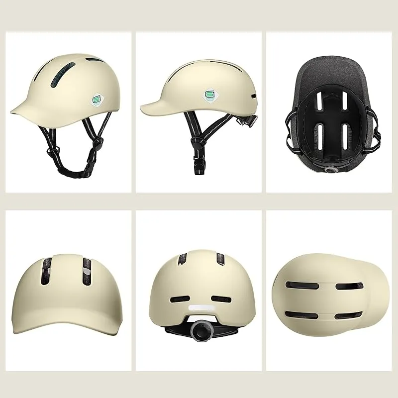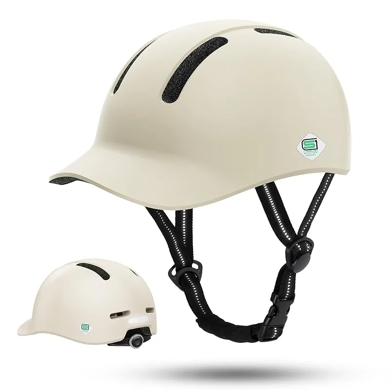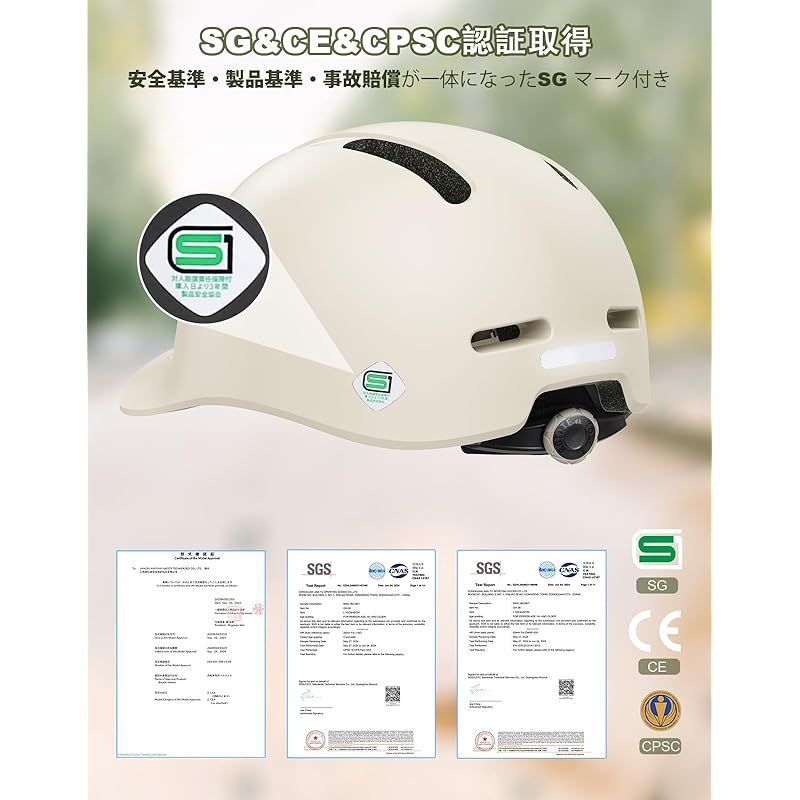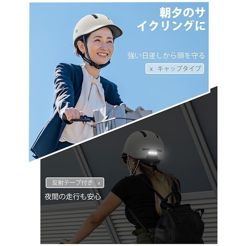 【朝夕のサイクリングに】ヘルメットはキャップタイプで強い日差しを防ぎ快適に使えます。ヘルメットの後ろには反射テープがあり、あごひもにも反射材が使われています、視認性を向上させ、夜道も安全です。安全と快適さを纏う、軽やかな都市型ライディングを???