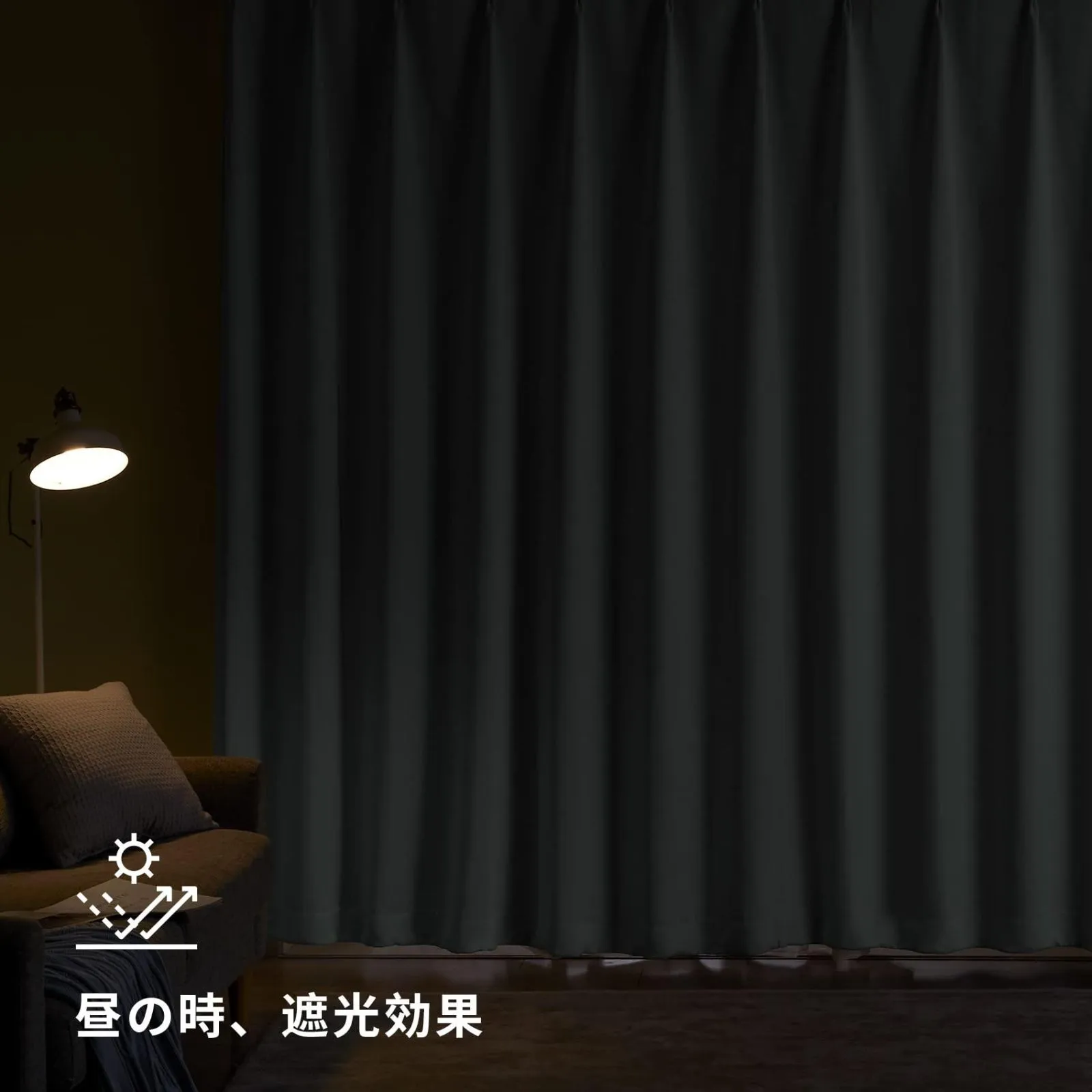 【一級遮光】このカーテンは遮光度が99.99%以上,外からの光をほとんど通さないため、昼間カーテンを閉めたお部屋のなかで相手の顔の表情が分からない程度にまでお部屋を暗くできます。 同じ等級であっても、カーテンの明度や色彩によって遮光の度合いが変わります。 薄い淡い色は光を通しやすく、濃い暗い色は光を通しにくいです。 遮光性を重視される方は濃色をおすすめします。