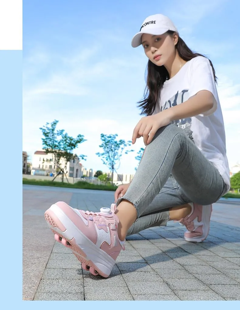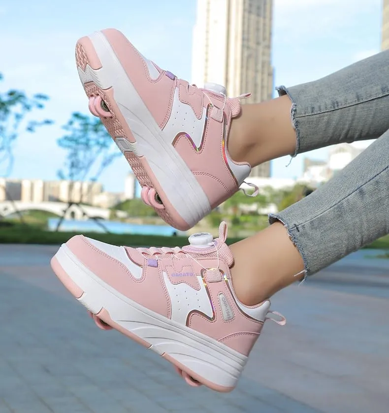 ワンタッチホイール脱着、歩行 / スケートモードを瞬時切り替え:専用レバーでホイールを簡単に起こしたり収納したりでき、歩行モードから暴走スケートモードへの切り替えがスムーズ。ホイールを取り外して蓋をすると、普通のスニーカーとしても使用可能。PU 素材製ホイールは滑りがスムーズで耐久性に優れ、長時間使用しても変形や摩耗が少なく、子供から大人まで楽しめる多機能シューズです。