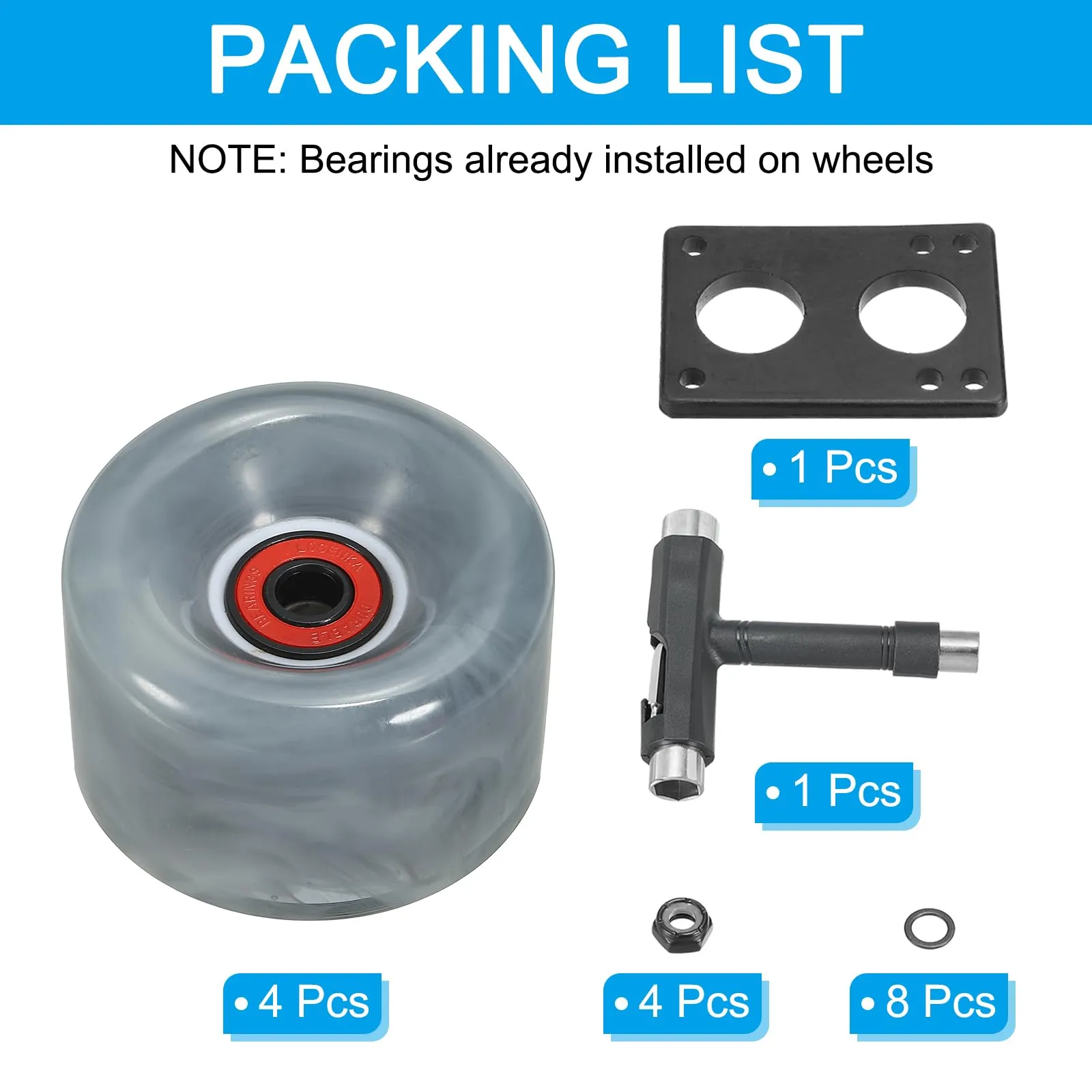 パッキングリスト:4 x スケートボードのホイール、1 x Tツール、8 x スケートボードベアリング、4 x アクスルナット、8 x ワッシャー、4 x フラッシュコア、2 x 3 mmライザーパッド