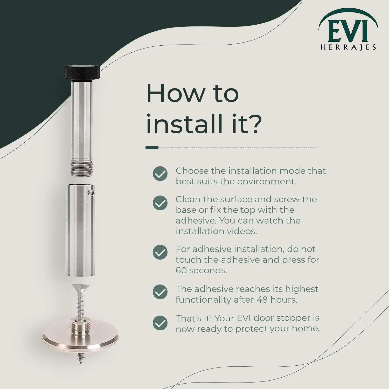 品質とサービス EVIは、優れた品質のドアストップを設計・製造してきた長い歴史を持つヨーロッパのメーカーです。製造からカスタマーサービスに至るまで、細部にまで気を配っています。