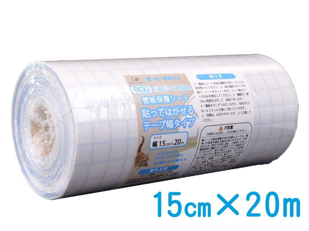 (幅15cm×長さ20m) テープ幅タイプ ペット壁紙保護シート (はがせる粘着シート) 半透明 グリーンウィーク 壁、ドア、家具の傷、汚れ、ペットしつけ、猫ひっかき防止
