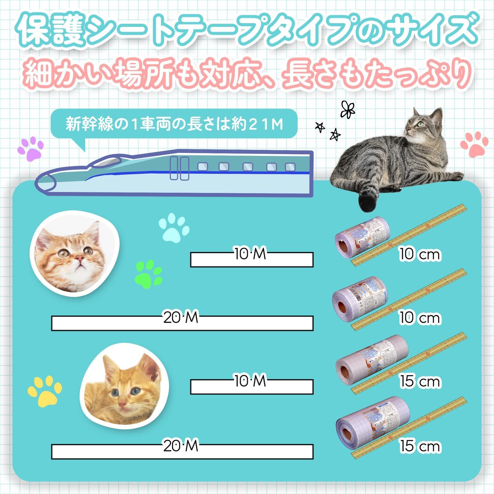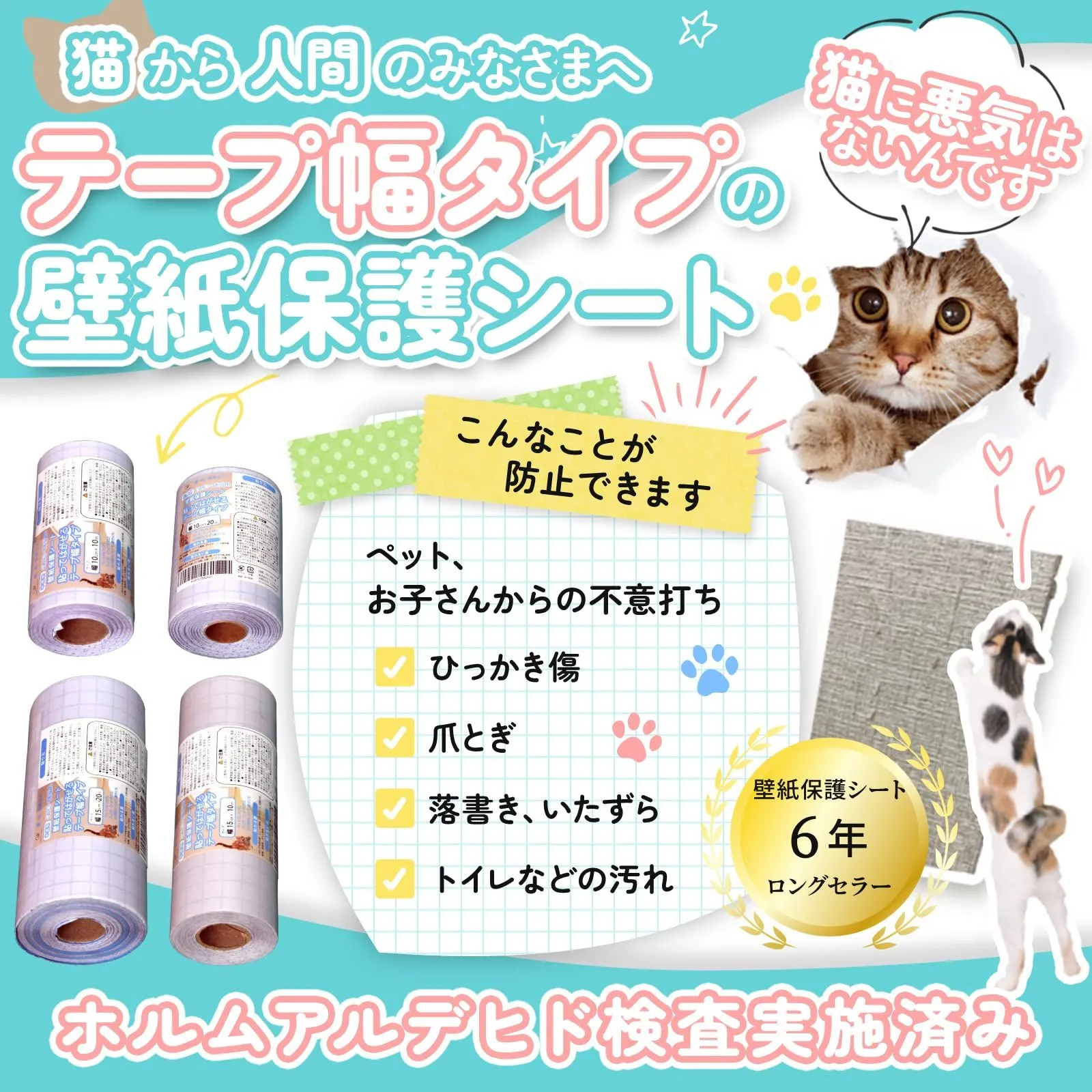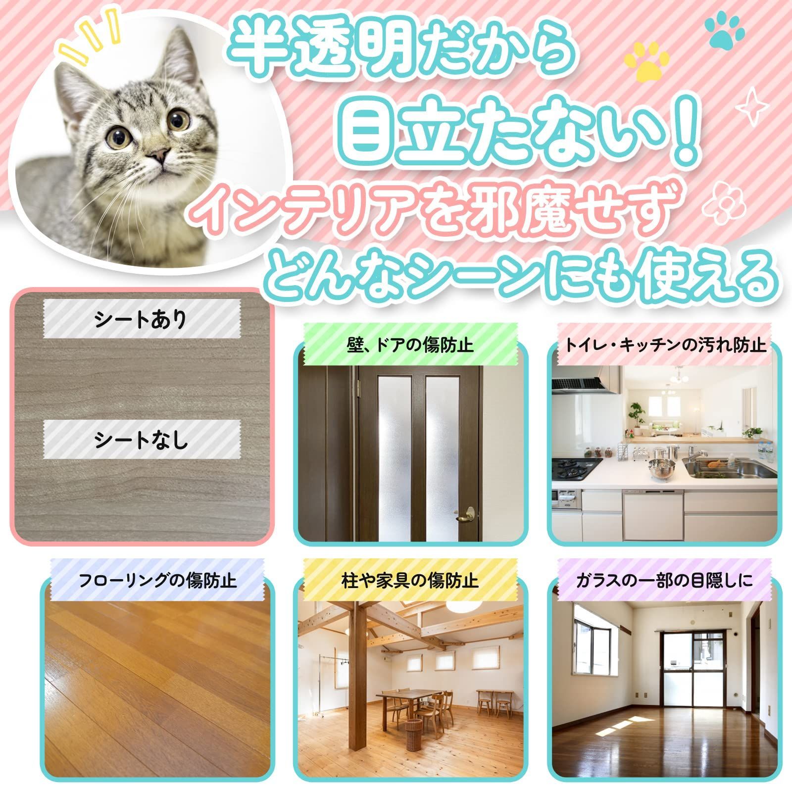 【こんな方におすすめ】 ・猫の爪とぎ対策をしたい方 ・犬のトイレ周り、ケージ、壁、床の汚れ防止したい方 ・子どもの落書きやシール貼り、トイレの尿飛びで困っている方 ・キッチン周りの油汚れ、油はね、洗面台、冷蔵庫・家具の背後などの汚れを防止したい方 ・賃貸で壁紙をきれいに保ちたい方