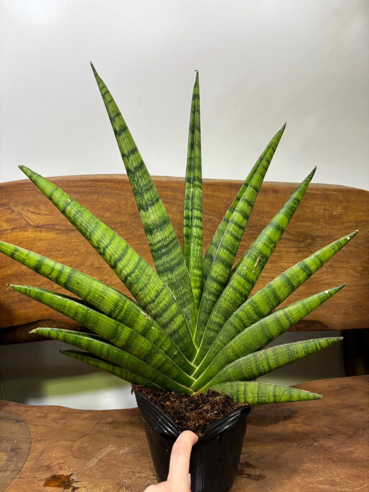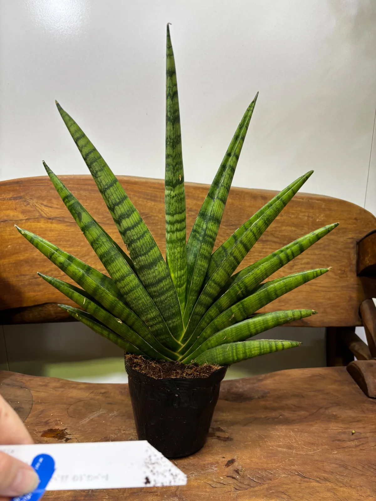 濃い緑の葉に、白い縞模様やシルバーブルーの光沢が美しいサンスベリアです。