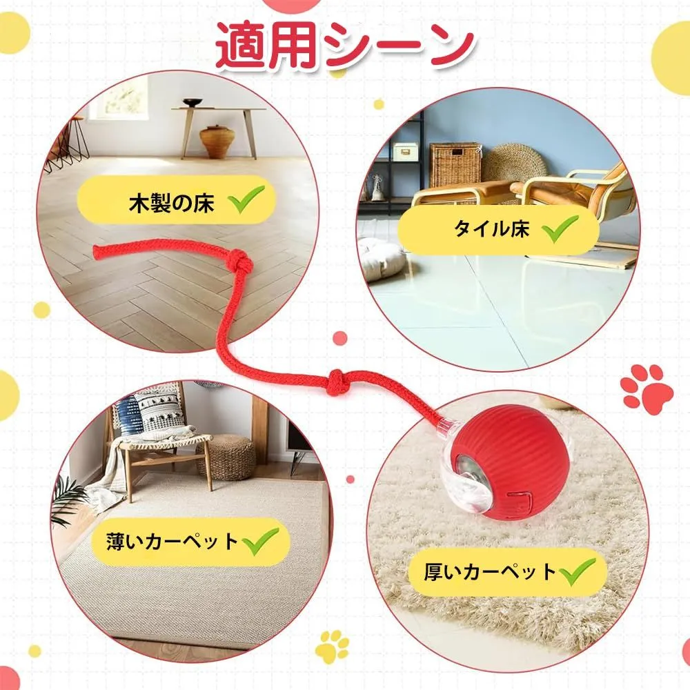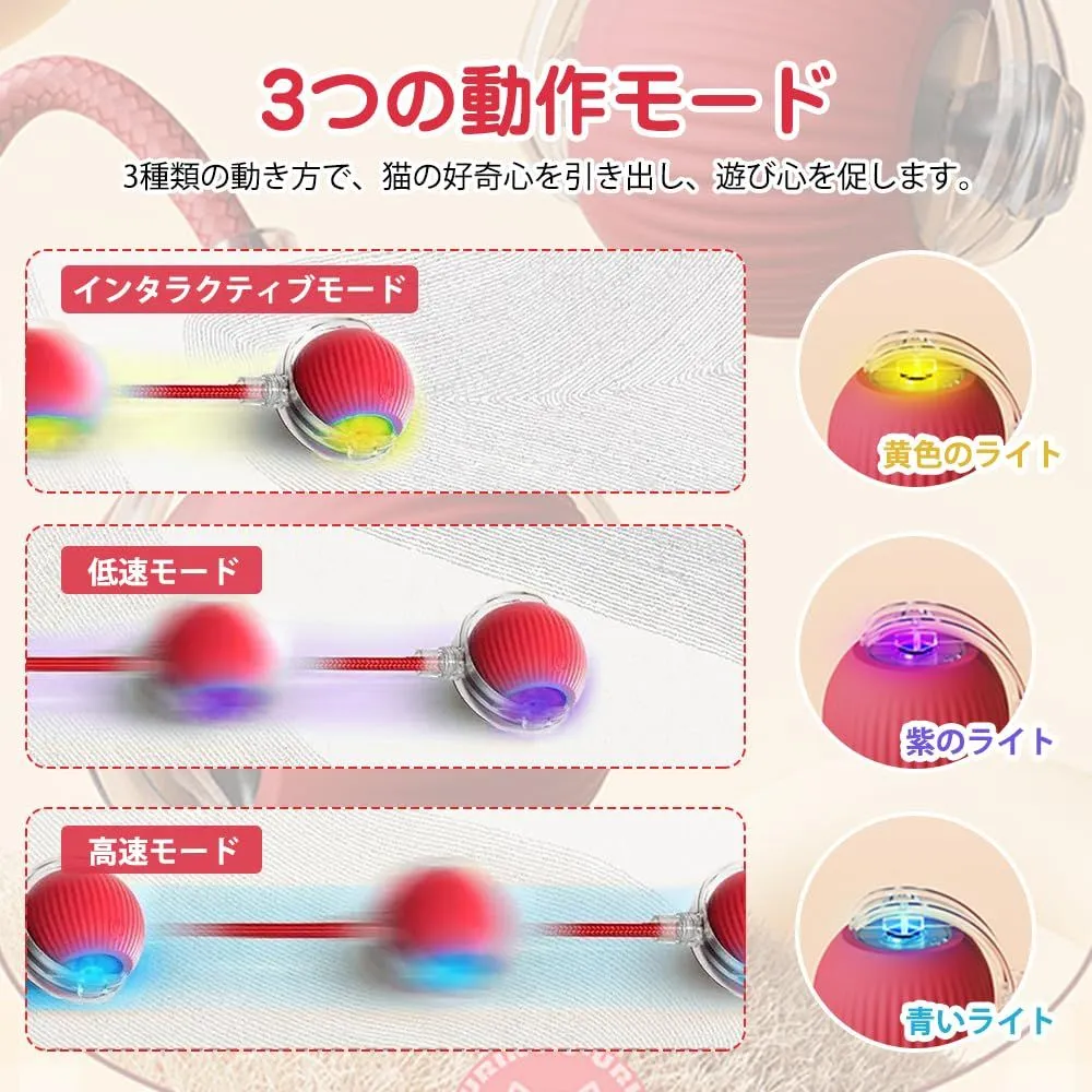 【3つの動作モード】3つのモードを選択できます:高速モード、低速モード、インタラクティブモード。(青いライト - 高速モード、紫のライト - 低速モード、黄色のライト - インタラクティブモード)転がり音が静かで、昼夜問わず遊びたい時に音を気にせず楽しめます。 猫に不思議な夜を、あなたには静かな睡眠を。 4.