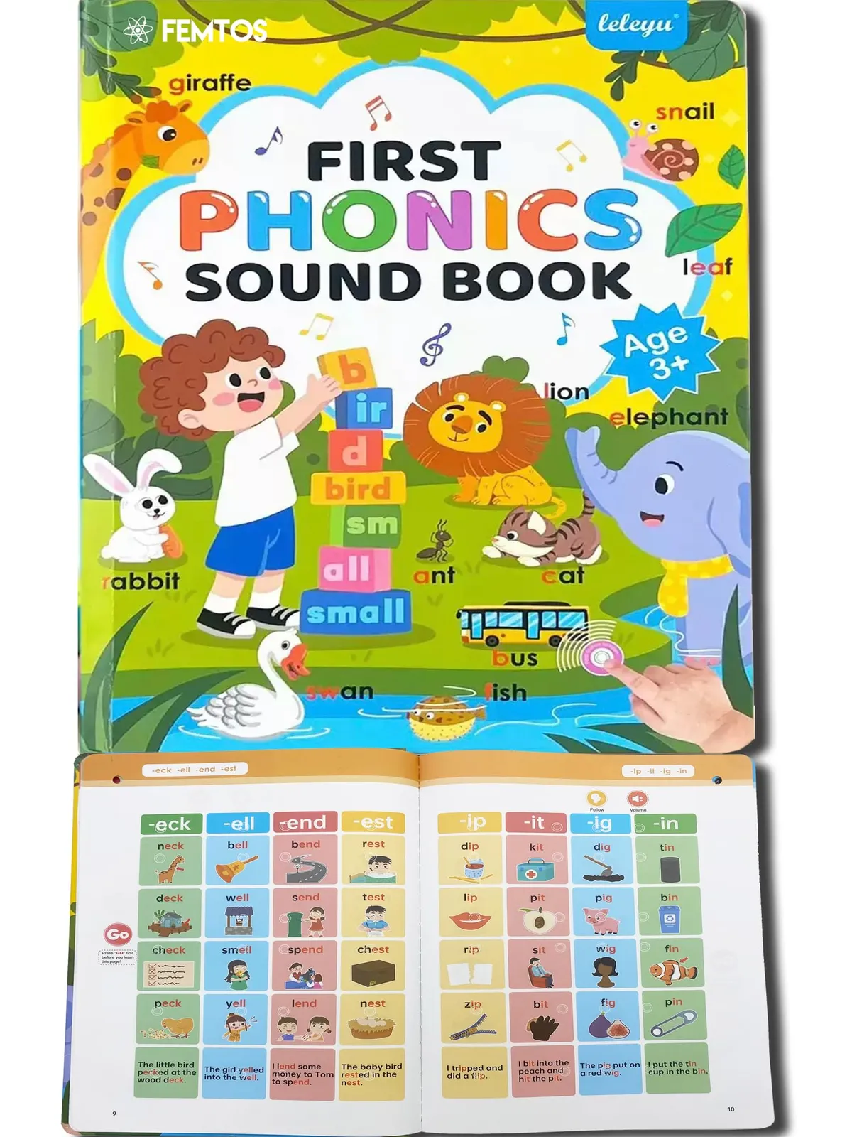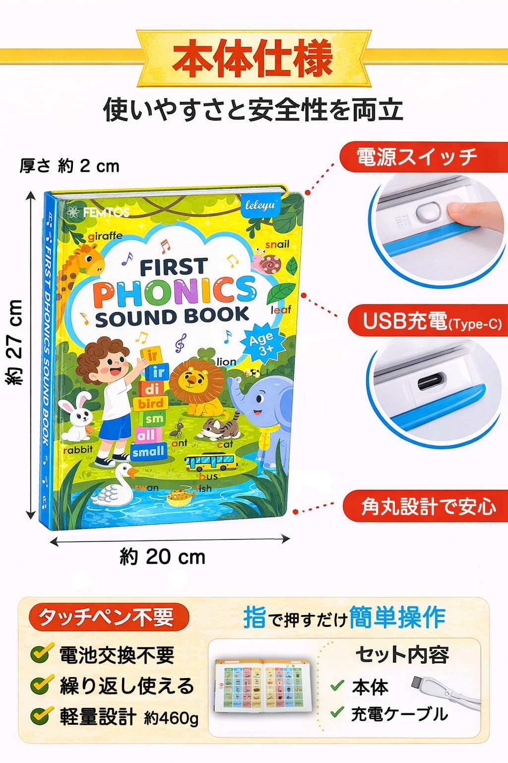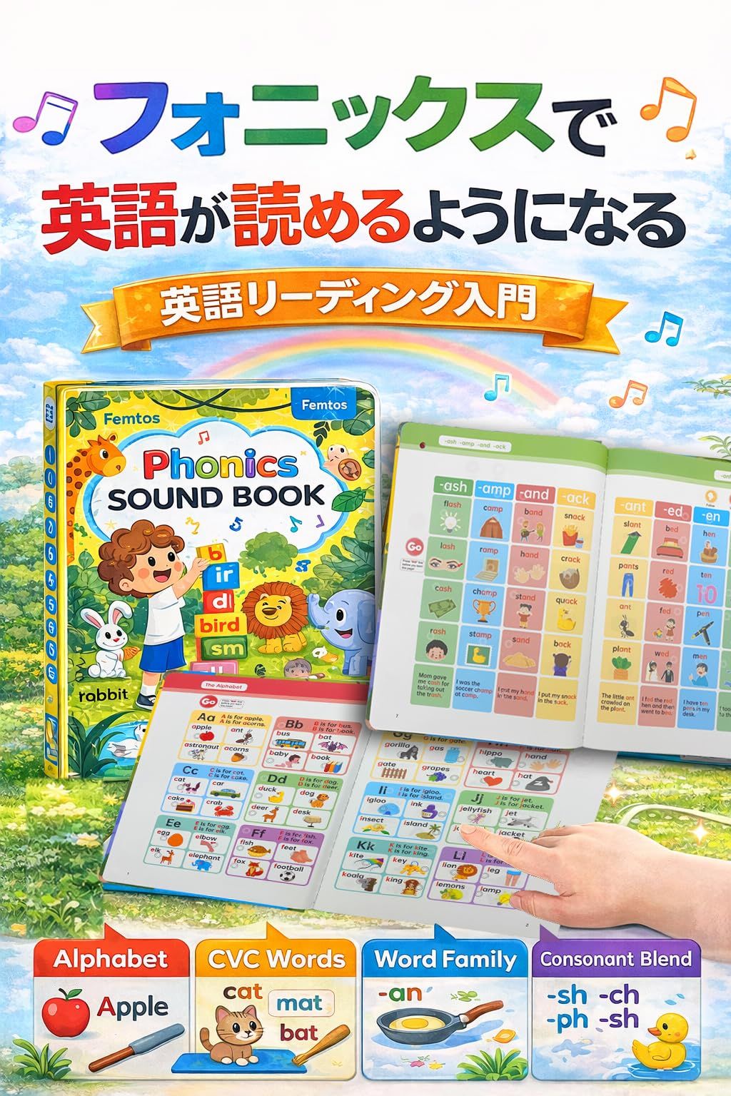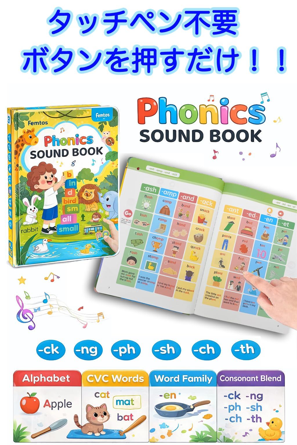 Femtos フォニックス サウンドブック 音が出る 英語絵本 タッチペン不要 充電式 Phonics 英語発音教材 CVC単語 Word Family Consonant Blend 英語リーディング入門 知育玩具 英語教材 子供 英語学習 英単語 Eng