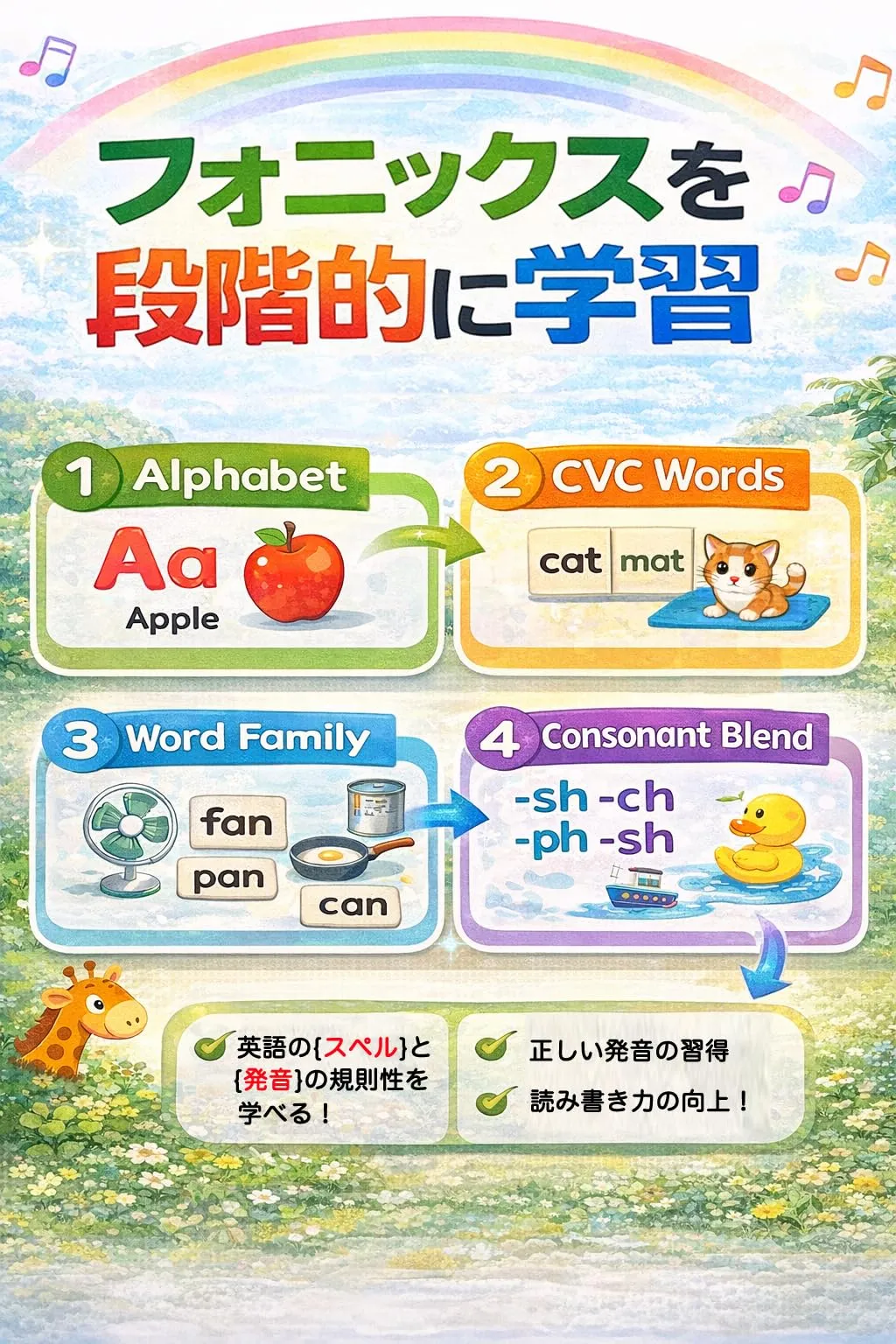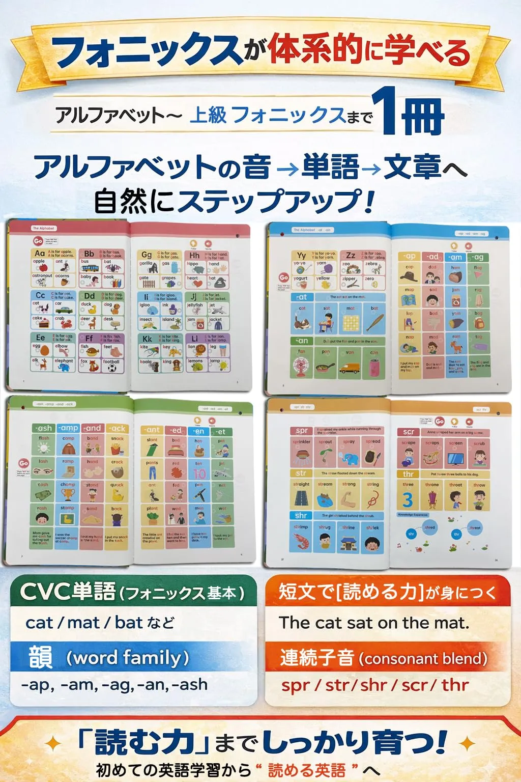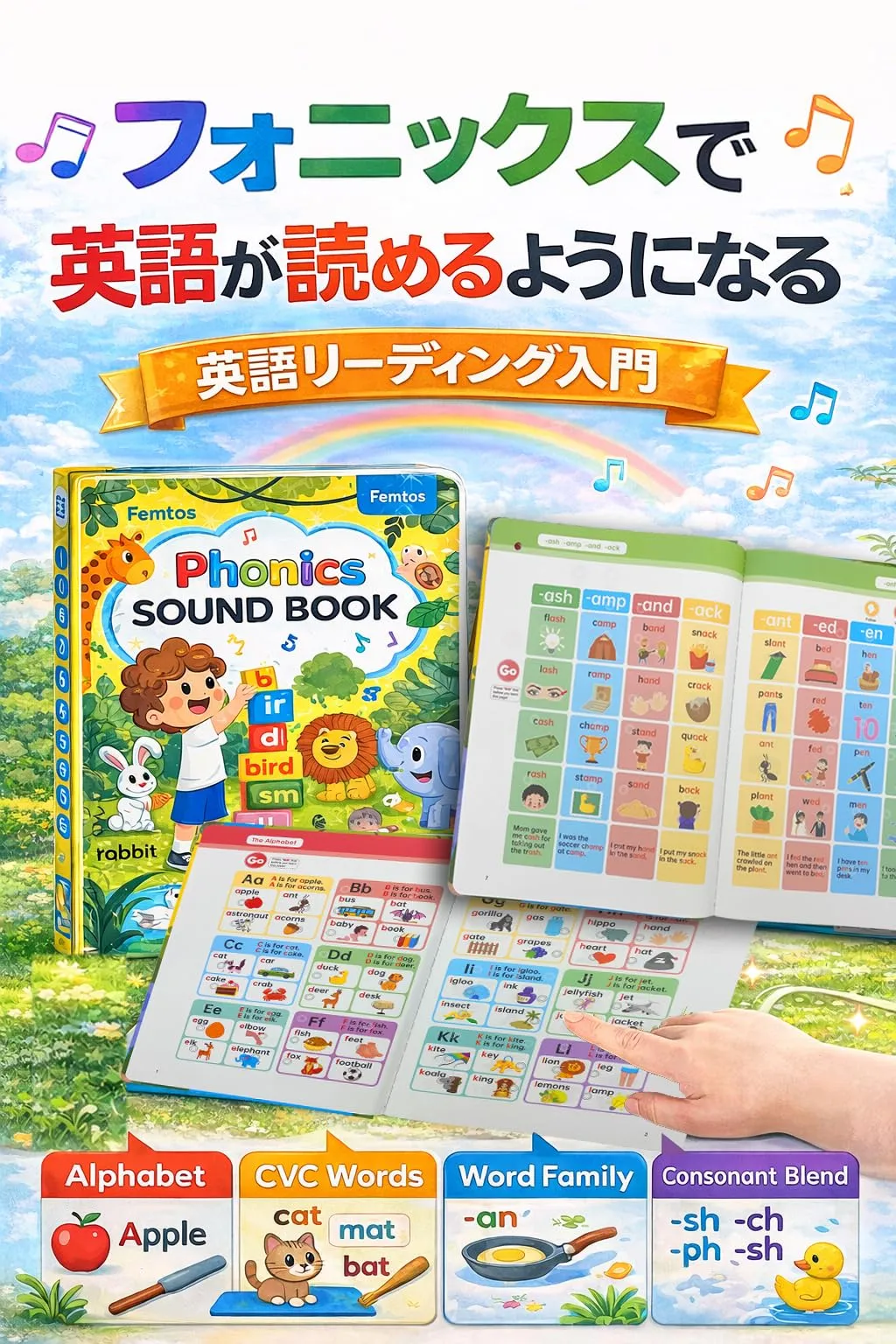 【フォニックス英語学習サウンドブック】 英語の読み方ルール「フォニックス」を楽しく学べる音声付き知育ブック。アルファベットの音からCVC単語、Word Family、Consonant Blendまで段階的に学習でき、英語の文字と音の関係を自然に理解できます。英語リーディングの基礎づくりに最適な英語教材です。