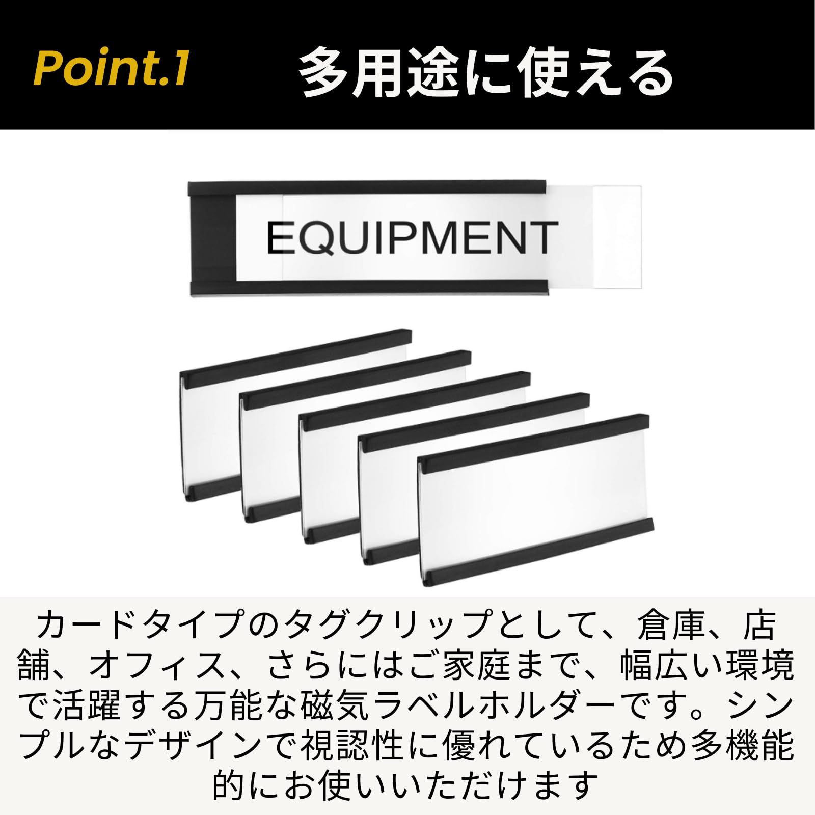 【多用途に使える】カードタイプのタグクリップとして、倉庫、店舗、オフィス、さらにはご家庭まで、幅広い環境で活躍する万能な磁気ラベルホルダーです。シンプルなデザインで視認性に優れているため、レストランのメニュー表示や鋼製棚の在庫管理、ファイリングキャビネットの整理など、効率的な情報表示を強力にサポートします。