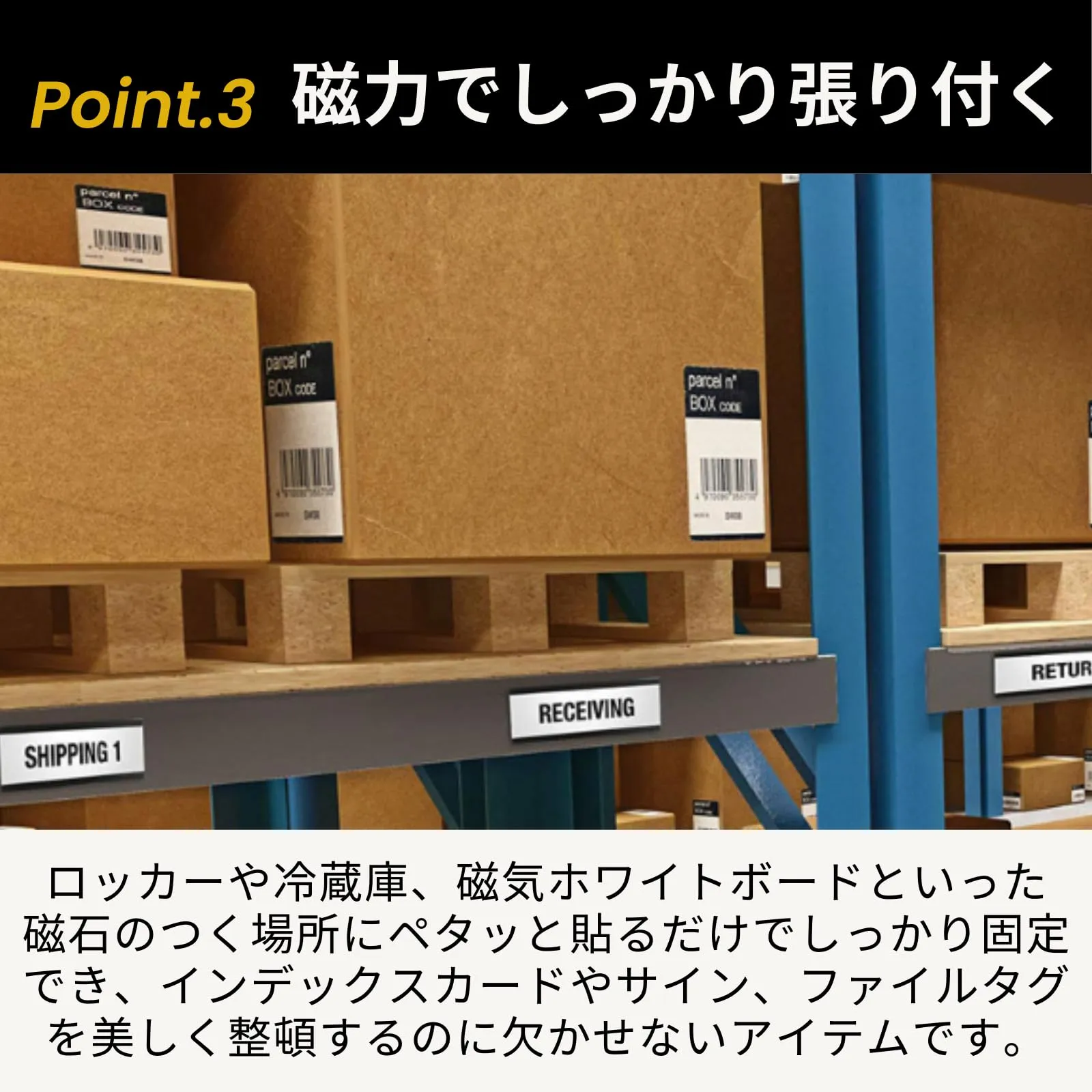 【磁力でしっかり張り付く】ロッカーや冷蔵庫、磁気ホワイトボードといった磁石のつく場所にペタッと貼るだけでしっかり固定でき、インデックスカードやサイン、ファイルタグを美しく整頓するのに欠かせないアイテムです。 身の回りの用品や機器、在庫状況を明確にラベル付けすることで、煩雑になりがちな空間をスマートに整理し、あらゆるシーンでの利便性を高めます