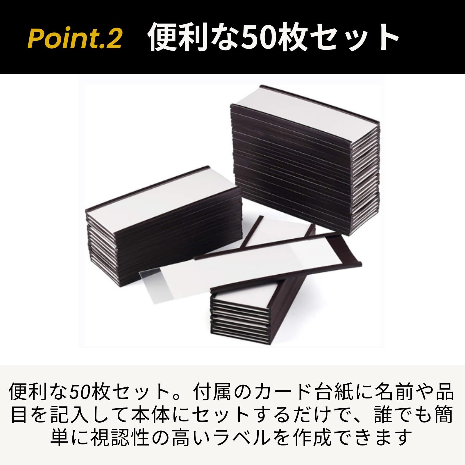 【便利な50枚セット】付属のカード台紙に名前や品目を記入して本体にセットするだけで、誰でも簡単に視認性の高いラベルを作成できます。台紙をスライドさせるだけで中身をスムーズに入れ替えられるため、内容の変更にも柔軟に対応し、何度でも繰り返し再利用できるのが大きな魅力です。市販のラベル用紙をサイズに合わせてカットして差し込むなど、用途に合わせた幅広いカスタマイズが可能です