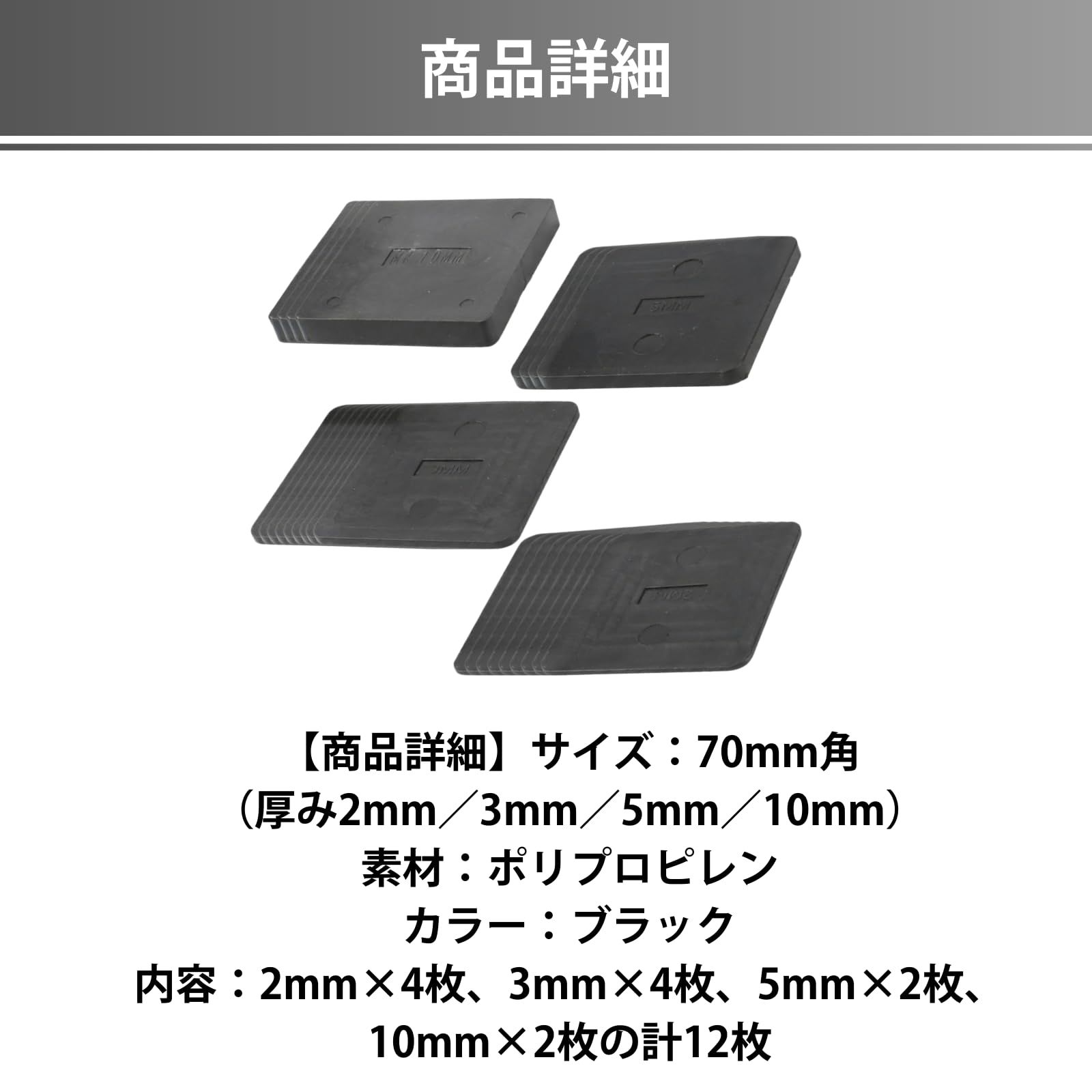 【商品詳細】サイズ:70mm角(厚み2mm/3mm/5mm/10mm) 素材:ポリプロピレン カラー:ブラック