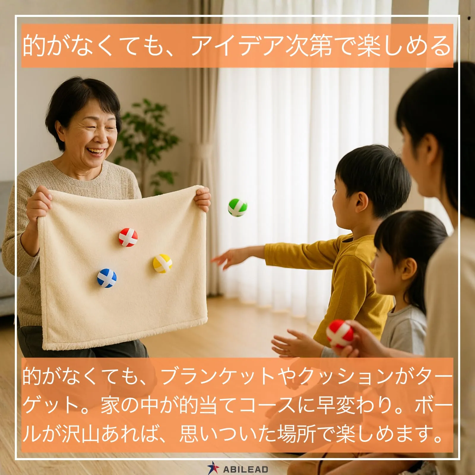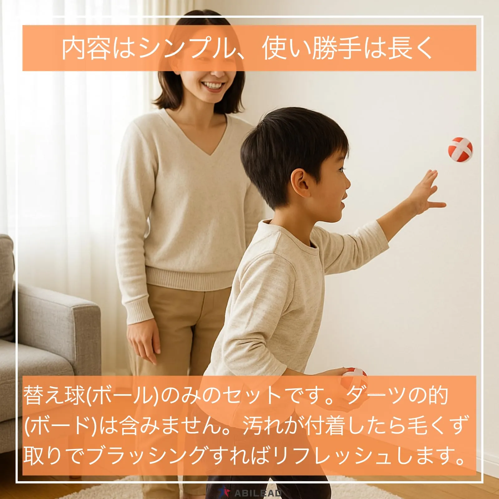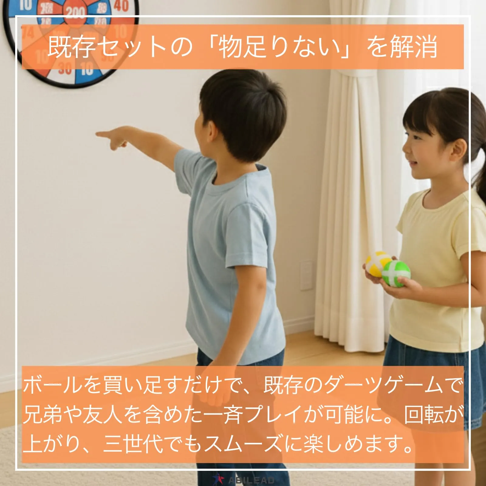 ●「床置きでも遊べる?」→安全面と視認性の点から、壁面など安定した面への取り付けを推奨します。 ご注意:本品はボール(替え球)単品の販売です。ボードは付属しません。写真と色味が多少異なる場合がありますが、機能に影響はありません。 ABILEADは“楽しい家庭あそび”をテーマに、迷いを減らす情報設計と、使い続けやすい品質の見える化に取り組んでいます。追加用ボールで人数も盛り上がりもプラス。短い時間でも家族の会話が増える。そんな日常づくりに、ぜひお役立てください。