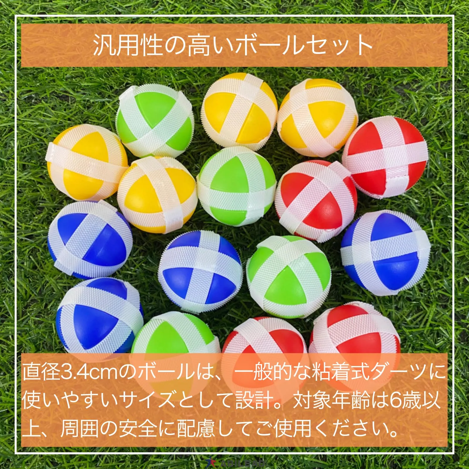 【商品仕様】ボールの直径は3.4cmでバリエーションは12個セット、24個セット、36個セットになります。商品は全て日本で検品、梱包しておりますので色はランダムではありません。赤、青、黄、緑の4色を12個セットは各色3個ずつ、24個セットは各色6個ずつ、36個セットは各色9個ずつのセットになります。色が偏ることはないので色合わせゲームにも最適です。 直径3.4cmの粘着ボールで、家のリビングが“すぐ遊べる”場所に変わります。ABILEADの替え球は、一般的な粘着式ダーツボードにそのまま付着する追加用ボール。色分けで自分のボールを判別しやすく、12個・24個・36個のセットから人数やシーンに合わせて選べます。既存セットに数球プラスするだけで同時プレイ人数が増え、順番待ちが短くなり、家族や来客の「もう一回!」が自然に続きます。針を使わないやわらかなボールだから、室内レクリエーションにも取り入れやすく、短い余白時間の“ちょい遊び”に最適です。 本品は“粘着式ダーツボード専用”です。磁石タイプや金属針タイプのボードには使用できません。直径3.4cmの小径・軽量設計は、子どもの手でも握りやすく、投げ出し時のブレを抑えて狙った位置にしっかり付着。面ファスナーの噛み合わせ面積を確保した設計で、連投しても気持ちよくプレイできます。色は視認性の高い配色を採用し、色別チーム戦やリレー形式など、遊び方のバリエーションを広げやすいのも特徴です。 弊社のボールは赤、青、黄、緑の4色を12個セットは各色3個ずつ、24個セットは各色6個ずつ、36個セットは各色9個ずつのセットになります。日本で検品、梱包をしておりますので、よくあるランダムカラーではありません。色の数が同じになるので色合わせゲームにも活用出来ます。 対象年齢は6歳以上。投球時は周囲や家具への接触に注意し、安全なスペースを確保したうえでご使用ください。 粘着ボールは繊維のひっかかりで付着する特性上、フリースや起毛ブランケット、パイル生地などの“毛足のある面”では付きやすく、つるつるした合成繊維や極薄の綿生地では弱く感じる場合があります。ダーツボードは粘着式の面素材を想定した製品にご使用ください。身近な布面で試す場合は、付きやすい面を選ぶことで満足度が高まります。 お手入れは簡単です。使用を重ねて表面に毛くずが付いたら、指先で優しく払い、毛くず取りブラシで軽くブラッシングしてください。付着力が戻り、使い心地がリフレッシュします。濡れた場合は陰干しでしっかり乾燥。保管は付属の袋やジッパー付き袋などで、ホコリを避けてください。直射日光や高温多湿の環境は避けると、より長く快適にお使いいただけます。 こんなシーンにおすすめです。雨の日の室内アクティビティ、帰宅後の5分レク、親戚が集まる時のアイスブレイク、学童やシニア施設での軽いレクリエーション、ホームパーティの余興など。追加用ボールがあるだけで、同時に遊べる人数が増え、回転が上がり、場の一体感が生まれます。色別に分かれて対戦したり、時間内に合計点を競ったり、家族ならではのルール作りも楽しめます。 よくある迷いを先読みしてお答えします。