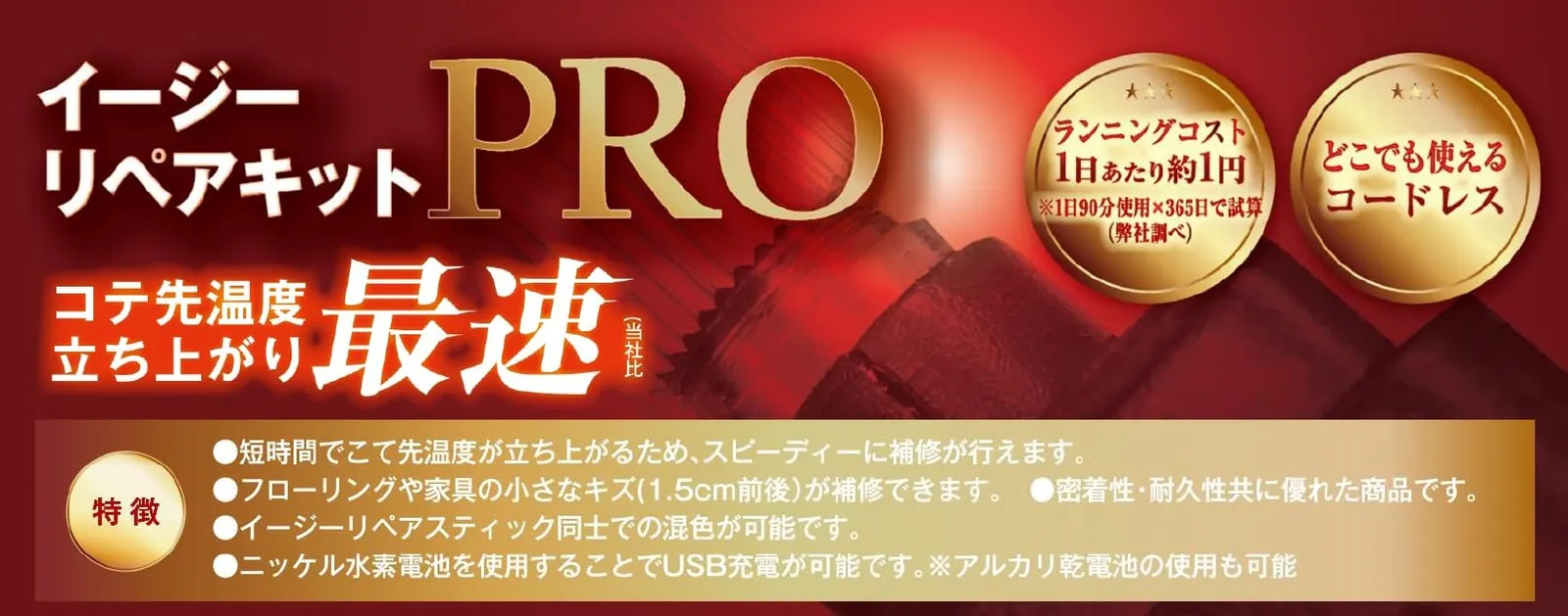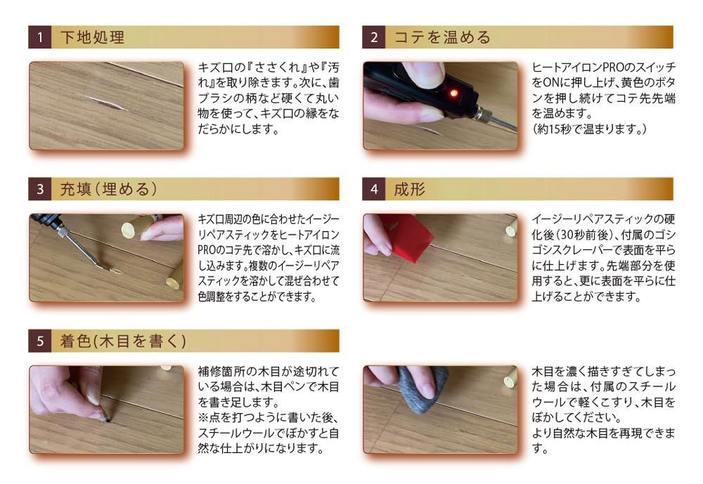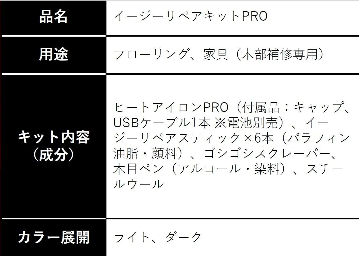 【特長】 フローリングや家具の小さなキズの補修が、初めての方にもできる定番人気の補修セットです。 木質フローリングに加え、塩ビ・オレフィンシートなど、熱に弱い素材を使用したフロア材の補修にも対応できます。 床暖房にも対応可能。