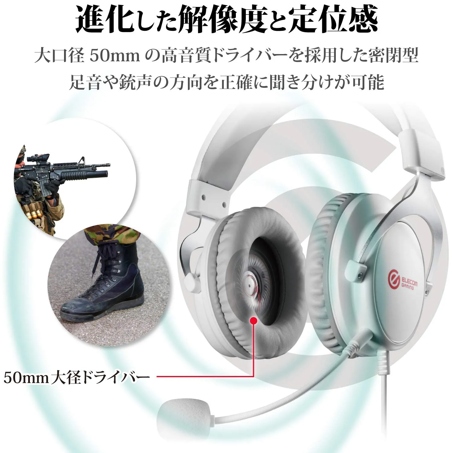 ■大口径50mmの高音質ドライバーを採用した密閉型のオーバーヘッドタイプで、足音や銃声の方向を正確に聞き分けが可能です。