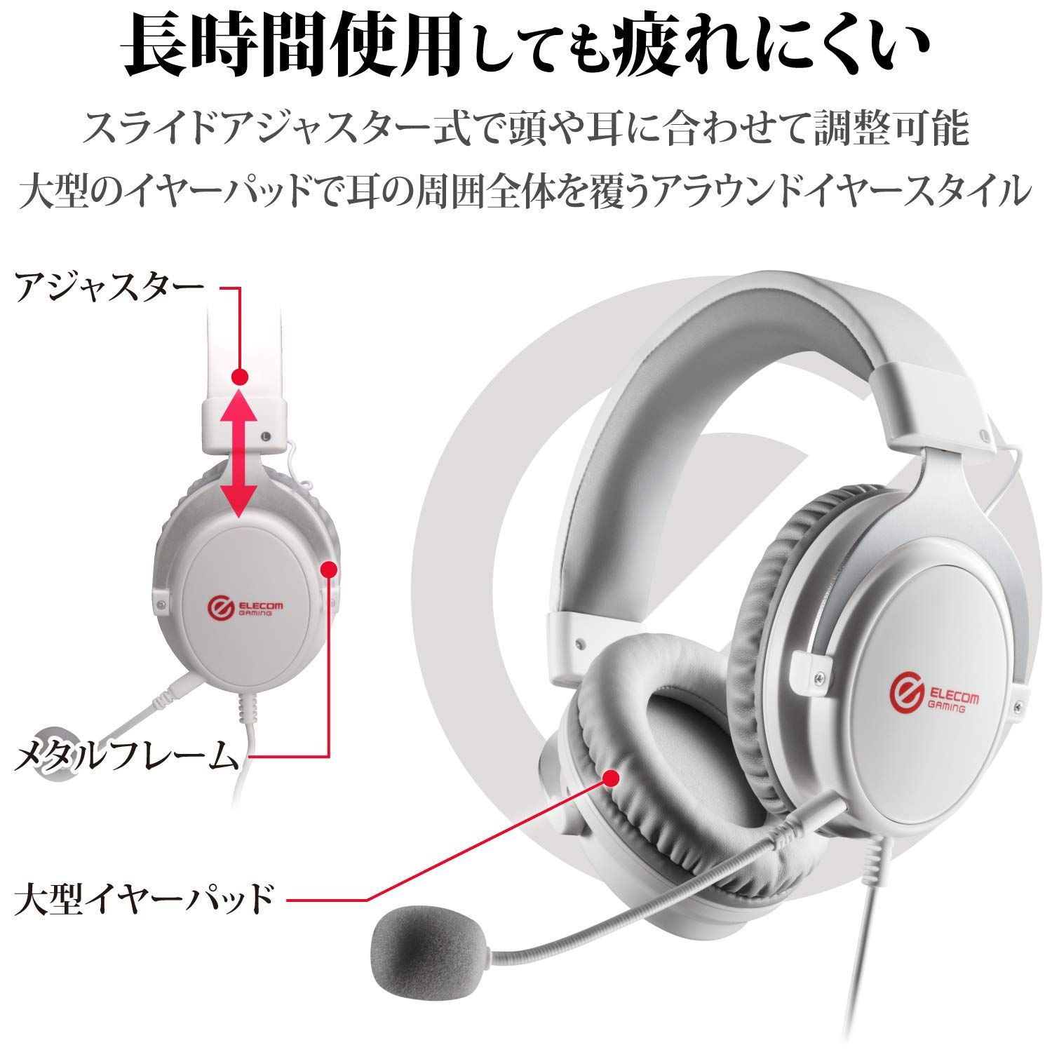 ■ヘッドバンドには、耐久性があり剛性の高い金属素材を採用しています。スライドアジャスター式なので頭や耳に合わせて調整可能です。