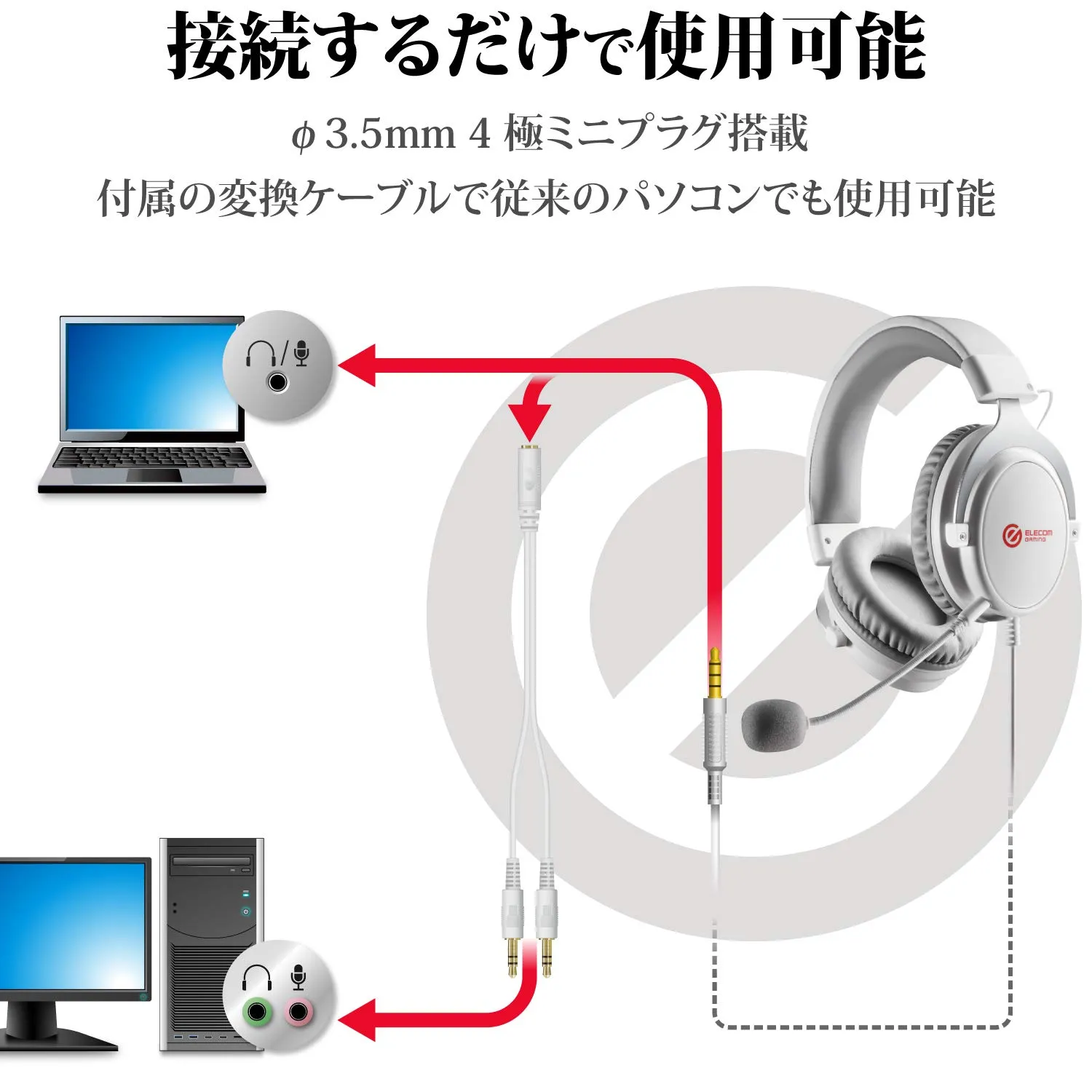 ■φ3.5mm 3極ミニプラグ×2(マイク×1、ヘッドホン×1)の変換ケーブルが付属していますので、4極ミニプラグのヘッドセット端子を搭載していない従来のパソコンでも使用可能です。