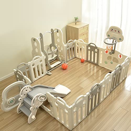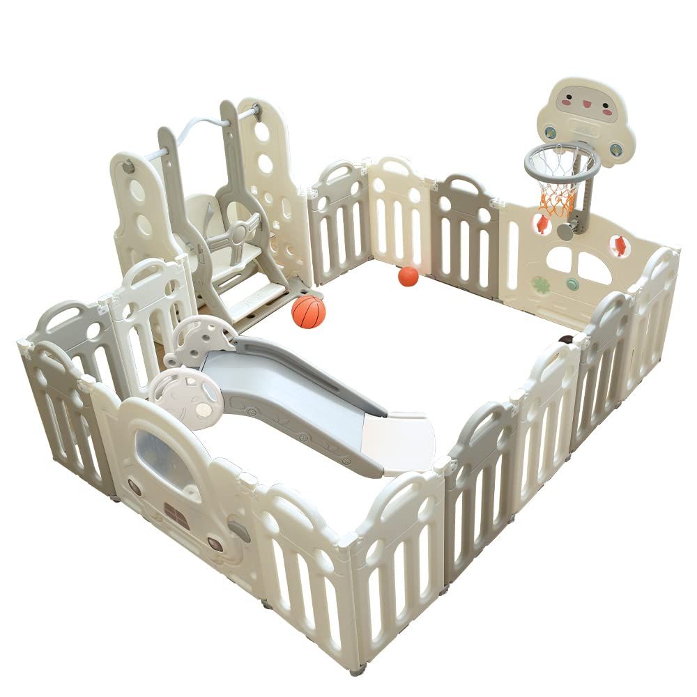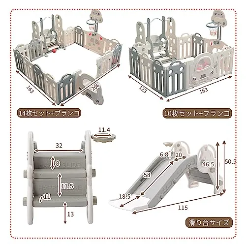 新品 OSJ ベビーサークル 滑り台 ブランコ折りたたみ 14枚セット 163*206cm 変形可能 扉付き すべり台 バスケットゴール付き おもちゃパネル ベビーゲート ベビーフェンス プレイヤード 簡単組立