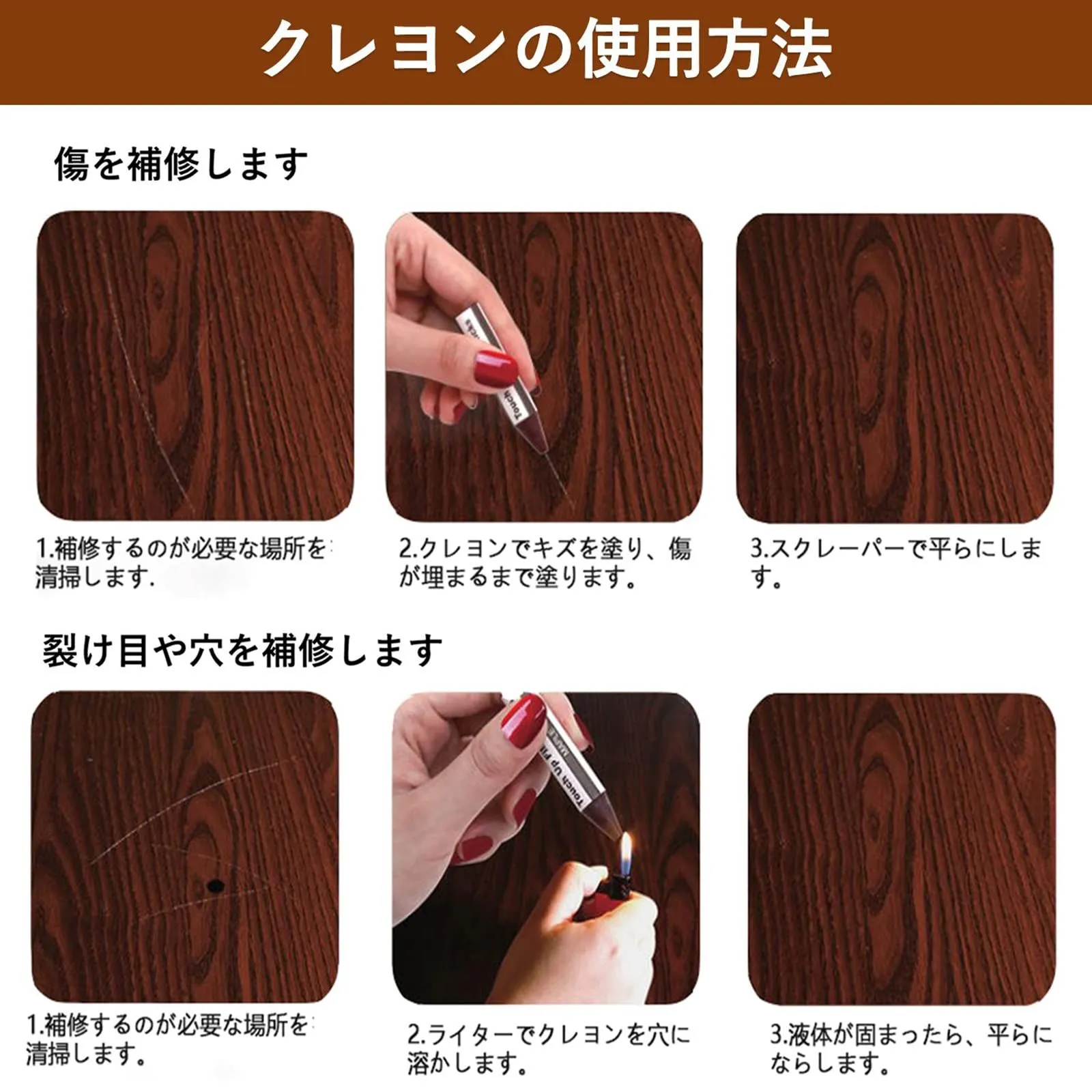 【使用簡単】キズ口の汚れやバリを取り除いて、ぴったり合う色を選んでください。補修ペンで家具の傷つけたところに塗り込みて、乾いた布で余分な顔料を取り除き、その部分を乾かします。(ペンでキズに着色、クレヨンで凹部分を埋めることにより目立たなくできます)