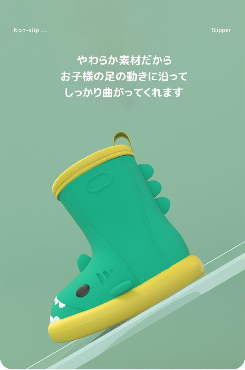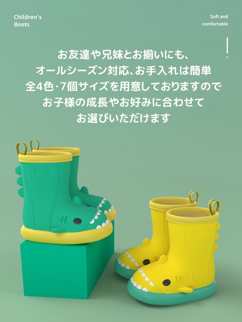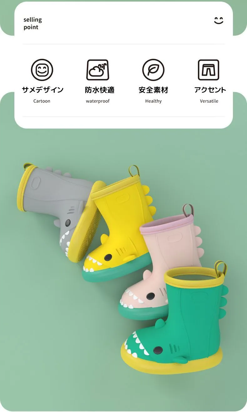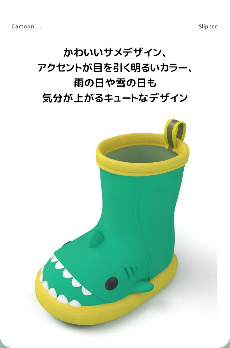 【POINT】 ・かわいいサメデザイン、アクセントが目を引く明るいカラー、雨の日や雪の日も気分が上がるキュートなデザイン。 ・やわらか素材だからお子様の足の動きに沿ってしっかり曲がってくれます。 ・ラバーアウトソールは滑りにくい素材で凸凹形状なので、地面をグリップしてくれるのがうれしいポイント。 ・全4色、7個サイズを用意しておりますので、お子様の成長やお好みに合わせてお選びいただけます。 ・お友達や兄妹とお揃いにも、オールシーズン対応、お手入れは簡単。
