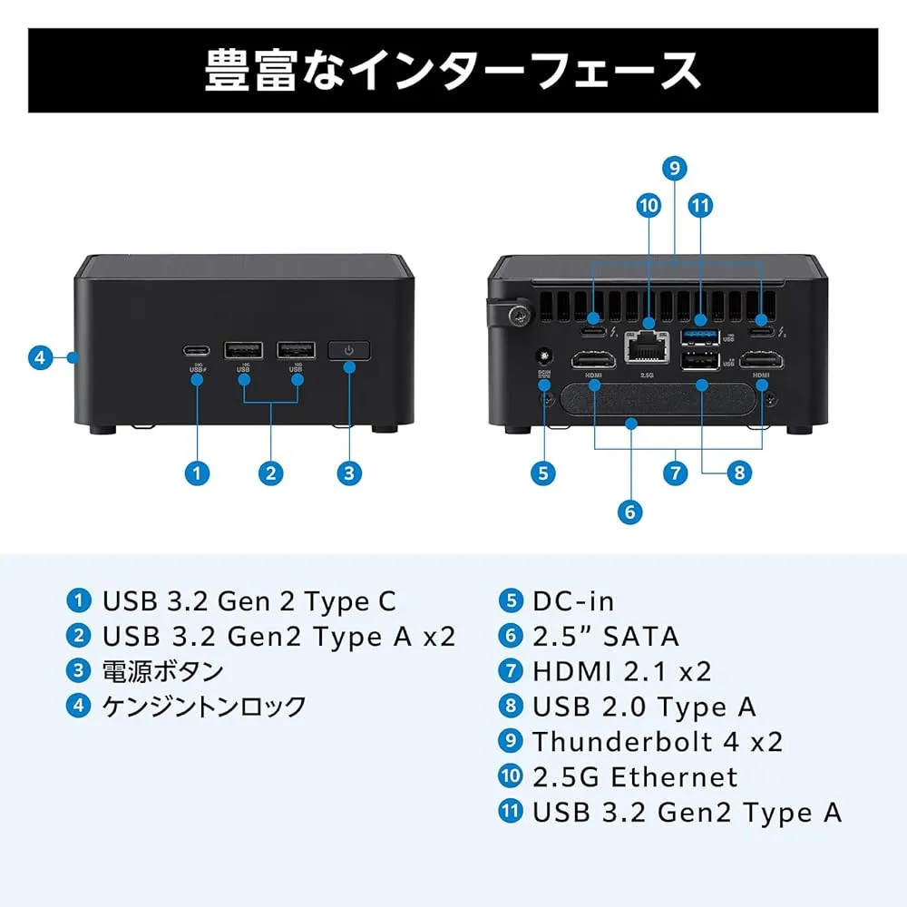 ●Back I/O Ports ・2×Thunderbolt 4 Type-C ポート ・1×USB 3.2 Gen 2 Type-A ・1×2.0 Type-A ・2×HDMI 2.1(TMDS)ポート ・1×RJ45 LANポート ・1×DC入力