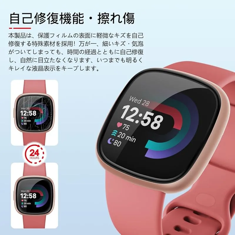 【商品説明】 対応機種:対応 Fitbit Versa4 / Fitbit Sense2 購入前に対応機種をご確認よろしくお願い致します パッケージ内容 3×全面保護フィルム 1x取扱説明書 1x気泡除去ヘラ 非常に柔らかいウレタン素材を採用する事により、湾曲部分に追従し画面の端まで保護することができ、Fitbit Versa4 / Fitbit Sense2独自のデザインを損なわず、まるでフィルムを貼ってないような仕上がりになります。