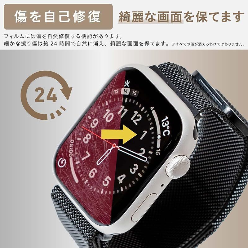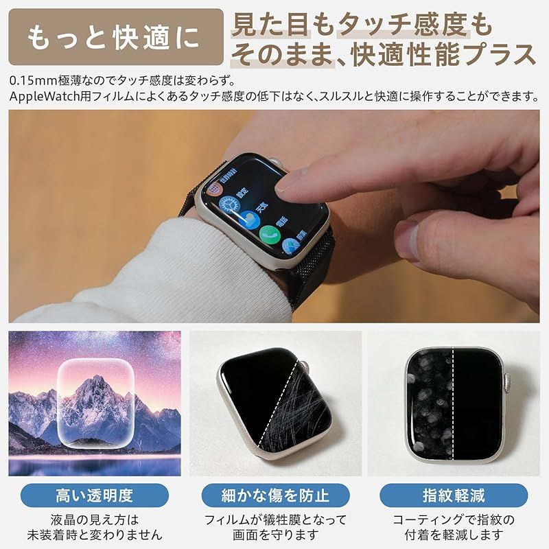 【タッチ感度良好】:0.15mm極薄なのでタッチ感度は変わらず。AppleWatch用フィルムによくあるタッチ感度の低下はなく、スルスルと快適に操作することができます。また、フィルムには傷を自然修復する機能があります。細かな擦り傷は約24時間で自然に消え、綺麗な画面を保てます。※すべての傷が消えるわけではありません。※メーカーに関わらず、タッチ感度重視のTPUフィルムは定期的に交換することを前提とした商品です。 ???