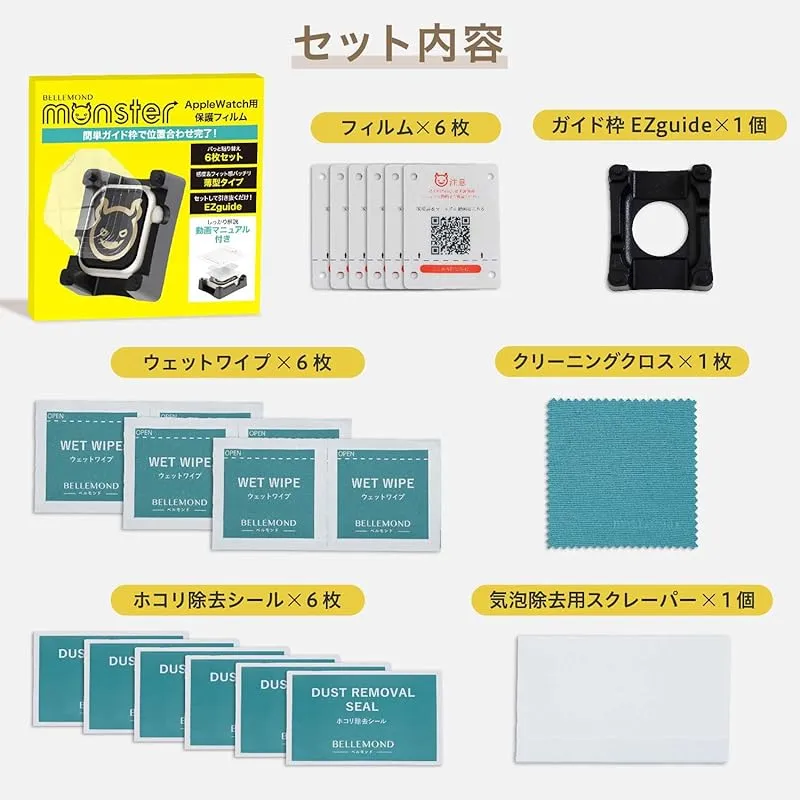 【ガイド枠EZguide】:AppleWatch用モンスターフィルムには、サイズ専用設計のガイド枠「EZguide」を付属しています。セットするだけで貼り付けの際に最も難しい「位置合わせ」が完了しますので、貼り付けが苦手な方にお試しいただけますと幸いです。 ???