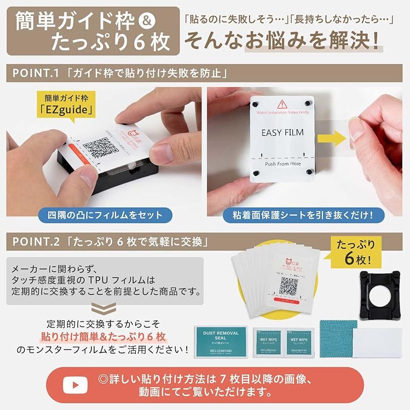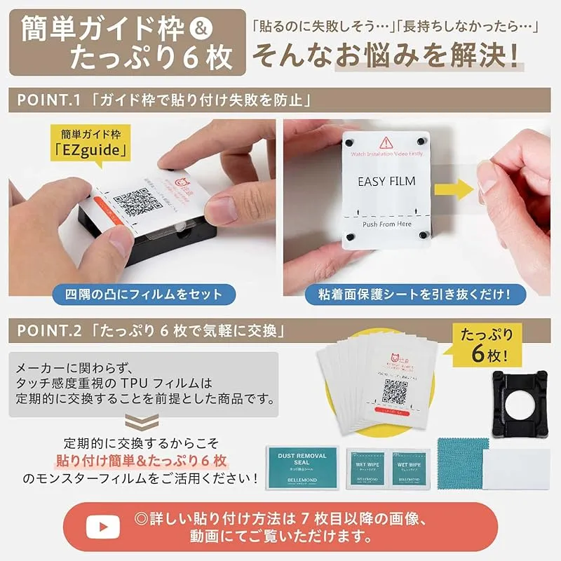 【セット内容】:フィルム × 6枚、ガイド枠 × 1個、 拭き取りシート × 6枚、ホコリ除去シール × 6枚、クリーニングクロス × 1枚、スクレーパー(ヘラ) × 1個