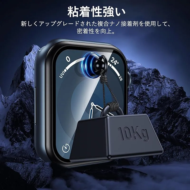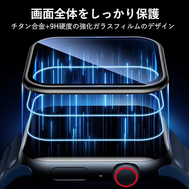 【商品概要】 「チタン合金フレームのApple Watch保護フィルム」チタン合金フレームのApple Watch保護フィルムはApple Watch本体と同じ素材のチタン合金+硬度9Hの強化ガラスフィルムを採用し、Apple Watchの画面から端までを保護し、耐磨耗性と耐衝撃性に優れ、ぶつけたりしても安心して使い、より全面的な保護を提供します。 「オリジナル製品と同色で一体感アップ」Apple Watchオリジナル製品のフレーム色と高さが一致しており、装着後はApple Watchオリジナル製品と一体化、装着した感覚がありません。 「粘着性強い&防塵防水」新しくアップグレードされた複合ナノ接着剤を使用して、密着性を向上。フレーム部分のみ吸着させることで気泡が入りにくい。水やホコリが入らず、汗などによる曇りもありません。極薄のフィルムが、つけていることを感じないほど快適なタッチ感を実現。 「高透過率&9H硬度」本Apple Watchガラスフィルムは厚さ0.25mmで、高精度で高透過率!撥油コーティングを採用し、指紋や油汚れを強力に防御します。表面硬度9H強化ガラス、Apple Watch画面への外部からの衝撃を保護、吸収します。 「取付け簡単」本製品にはApple Watchフィルム貼り用ツール(定位器*1、丸型固定用キット*1、クリーニングキット*1、無塵クロス*1、気泡除去ヘラ*1、日本語説明書*1)が付属しており、初めての方でも簡単に貼ることができます。