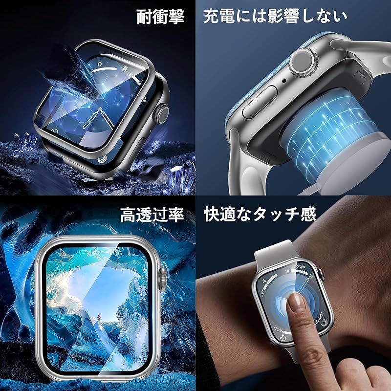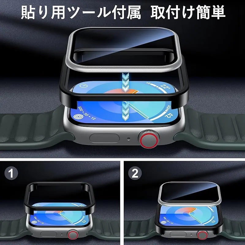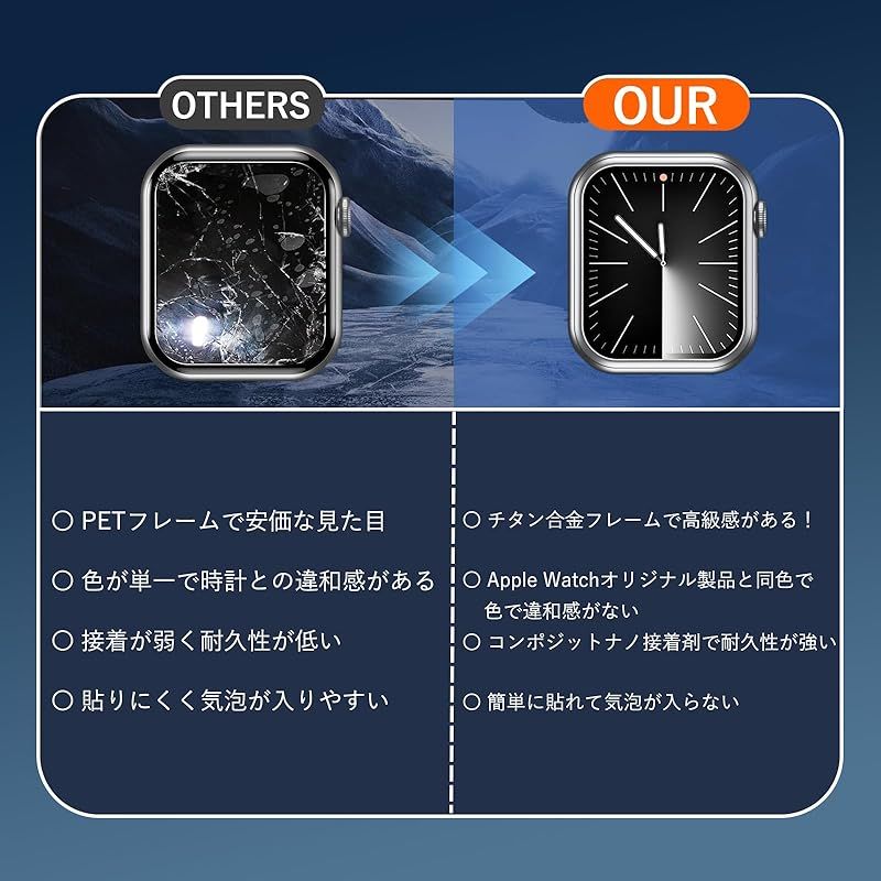 【商品概要】 「チタン合金フレームのApple Watch保護フィルム」チタン合金フレームのApple Watch保護フィルムはApple Watch本体と同じ素材のチタン合金+硬度9Hの強化ガラスフィルムを採用し、Apple Watchの画面から端までを保護し、耐磨耗性と耐衝撃性に優れ、ぶつけたりしても安心して使い、より全面的な保護を提供します。 「オリジナル製品と同色で一体感アップ」Apple Watchオリジナル製品のフレーム色と高さが一致しており、装着後はApple Watchオリジナル製品と一体化、装着した感覚がありません。 「粘着性強い&防塵防水」新しくアップグレードされた複合ナノ接着剤を使用して、密着性を向上。フレーム部分のみ吸着させることで気泡が入りにくい。水やホコリが入らず、汗などによる曇りもありません。極薄のフィルムが、つけていることを感じないほど快適なタッチ感を実現。 「高透過率&9H硬度」本Apple Watchガラスフィルムは厚さ0.25mmで、高精度で高透過率!撥油コーティングを採用し、指紋や油汚れを強力に防御します。表面硬度9H強化ガラス、Apple Watch画面への外部からの衝撃を保護、吸収します。 「取付け簡単」本製品にはApple Watchフィルム貼り用ツール(定位器*1、丸型固定用キット*1、クリーニングキット*1、無塵クロス*1、気泡除去ヘラ*1、日本語説明書*1)が付属しており、初めての方でも簡単に貼ることができます。