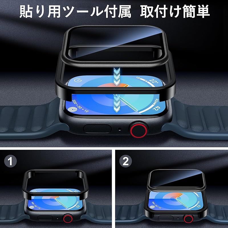 【商品概要】 「チタン合金フレームのApple Watch保護フィルム」チタン合金フレームのApple Watch保護フィルムはApple Watch本体と同じ素材のチタン合金+硬度9Hの強化ガラスフィルムを採用し、Apple Watchの画面から端までを保護し、耐磨耗性と耐衝撃性に優れ、ぶつけたりしても安心して使い、より全面的な保護を提供します。 「オリジナル製品と同色で一体感アップ」Apple Watchオリジナル製品のフレーム色と高さが一致しており、装着後はApple Watchオリジナル製品と一体化、装着した感覚がありません。 「粘着性強い&防塵防水」新しくアップグレードされた複合ナノ接着剤を使用して、密着性を向上。フレーム部分のみ吸着させることで気泡が入りにくい。水やホコリが入らず、汗などによる曇りもありません。極薄のフィルムが、つけていることを感じないほど快適なタッチ感を実現。 「高透過率&9H硬度」本Apple Watchガラスフィルムは厚さ0.25mmで、高精度で高透過率!撥油コーティングを採用し、指紋や油汚れを強力に防御します。表面硬度9H強化ガラス、Apple Watch画面への外部からの衝撃を保護、吸収します。 「取付け簡単」本製品にはApple Watchフィルム貼り用ツール(定位器*1、丸型固定用キット*1、クリーニングキット*1、無塵クロス*1、気泡除去ヘラ*1、日本語説明書*1)が付属しており、初めての方でも簡単に貼ることができます。