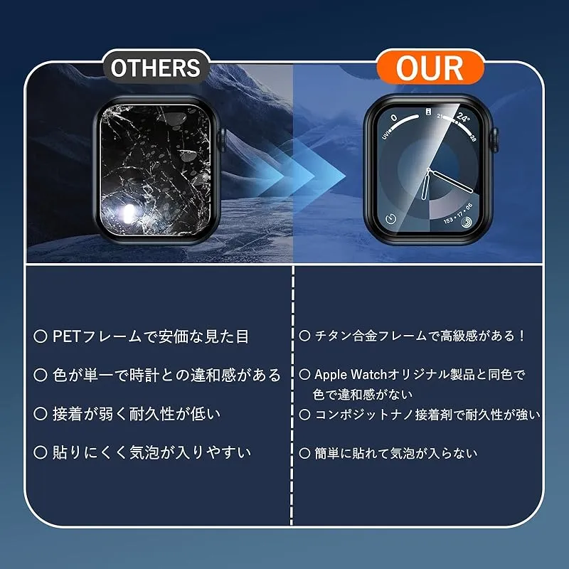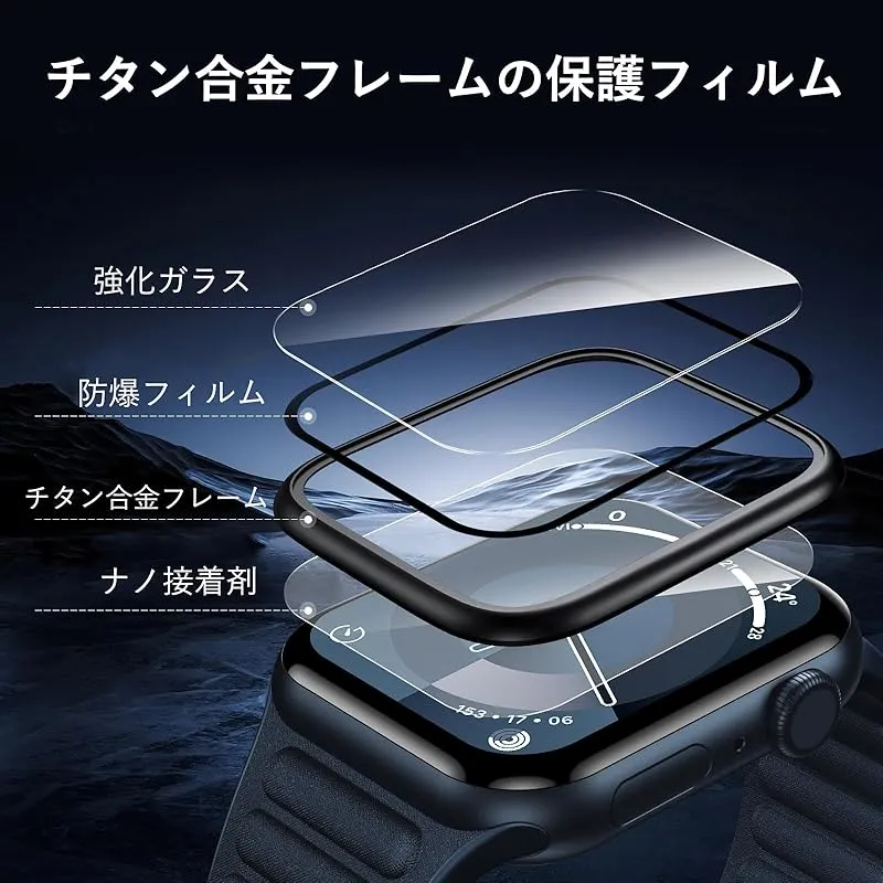 【商品概要】 「チタン合金フレームのApple Watch保護フィルム」チタン合金フレームのApple Watch保護フィルムはApple Watch本体と同じ素材のチタン合金+硬度9Hの強化ガラスフィルムを採用し、Apple Watchの画面から端までを保護し、耐磨耗性と耐衝撃性に優れ、ぶつけたりしても安心して使い、より全面的な保護を提供します。 「オリジナル製品と同色で一体感アップ」Apple Watchオリジナル製品のフレーム色と高さが一致しており、装着後はApple Watchオリジナル製品と一体化、装着した感覚がありません。 「粘着性強い&防塵防水」新しくアップグレードされた複合ナノ接着剤を使用して、密着性を向上。フレーム部分のみ吸着させることで気泡が入りにくい。水やホコリが入らず、汗などによる曇りもありません。極薄のフィルムが、つけていることを感じないほど快適なタッチ感を実現。 「高透過率&9H硬度」本Apple Watchガラスフィルムは厚さ0.25mmで、高精度で高透過率!撥油コーティングを採用し、指紋や油汚れを強力に防御します。表面硬度9H強化ガラス、Apple Watch画面への外部からの衝撃を保護、吸収します。 「取付け簡単」本製品にはApple Watchフィルム貼り用ツール(定位器*1、丸型固定用キット*1、クリーニングキット*1、無塵クロス*1、気泡除去ヘラ*1、日本語説明書*1)が付属しており、初めての方でも簡単に貼ることができます。