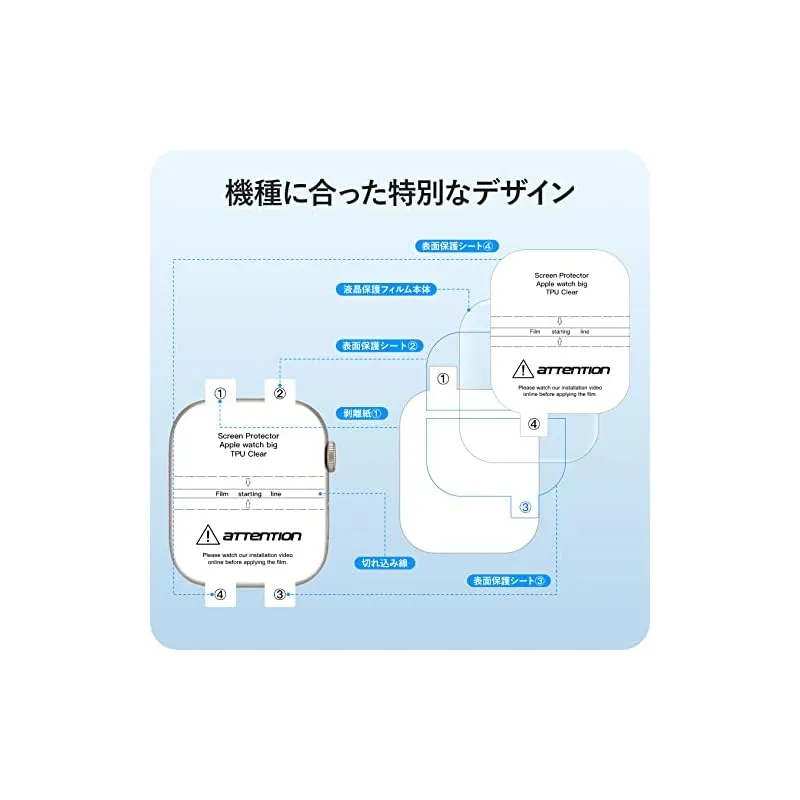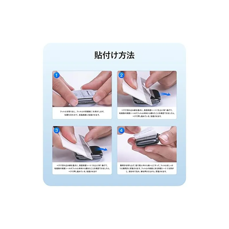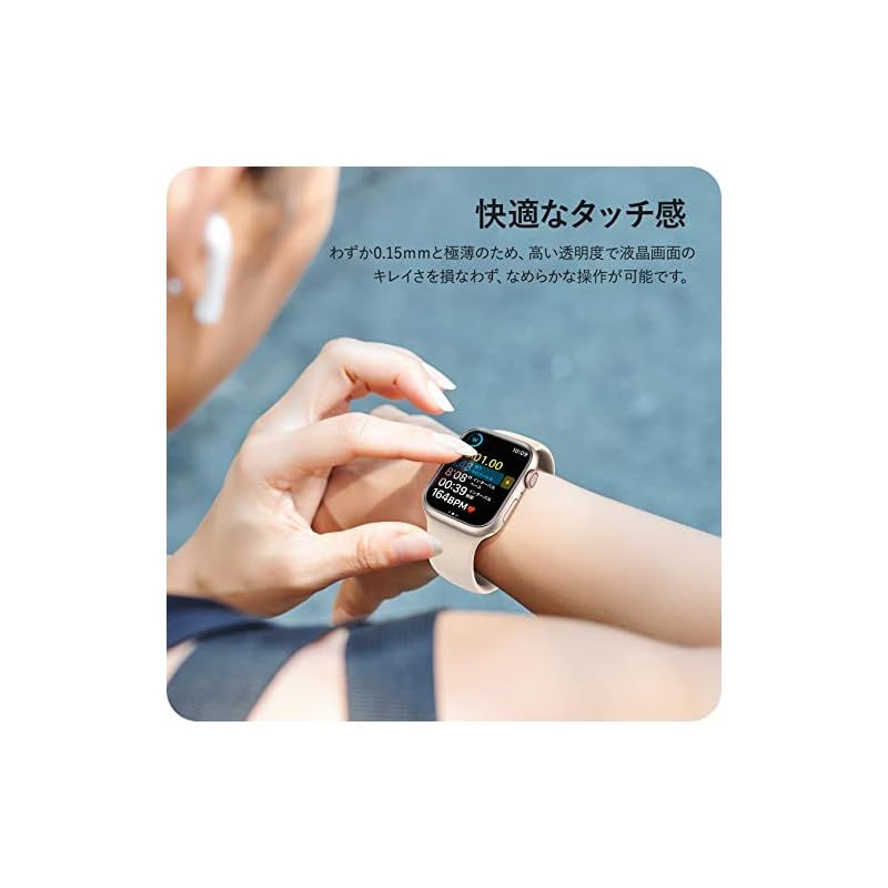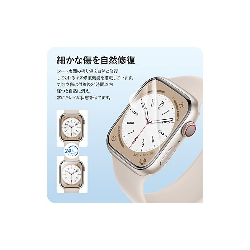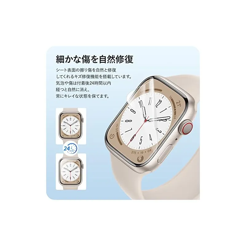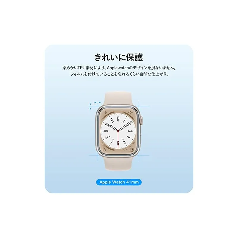 【商品概要】 対応機種:Apple Watch series 9 / 8 / 7 41mm 用 「ほどよいサイズデザイン:apple watch本体の縁まで適度なスペースを残すデザインとなっており、フィルムの剥がれや浮き上がりを防止し、apple watchケースと干渉せずに快適に使えます。」*ロット生産により、シリカゲル製滑り止めマットが方形の可能性もございますが、使用上には影響になりませんので、ご安心ください。 高透過率&高感度タッチ:高透過率を持つ極薄TPU素材製、フィルムの装着感はゼロで、高い透明感Apple Watch画面の精細さを保ちます。高い品質なTPUで優れたタッチ感を実現します。 面白い貼り付け方法:フィルムの上はステップ、とのローマ字を書いています。パッケージに含まれる日本語の取扱説明書をよく読み、面白い貼り付けのプロセスを楽しみましょう。*環境保護のコンセプトに基づいて、再利用可能なクロスは2枚のみ提供しています。予めご了承ください。 汚れ防止・指紋防止:撥水撥油コーティングを施されて、指紋など汚れが付きにくく。 万が一、汚れが付けば、簡単に拭い取って、すぐに綺麗になります。いつでも画面がツルツルの状態を維持られます。長時間水に触れると剥がれる恐れがあります。予めご了承ください。 キズレスと気泡レス:優れた伸縮性を持っていて、フィルム表面の細いキズと貼り付け時に小さい気泡が発生てしまった場合、通常24時間内で消えます。