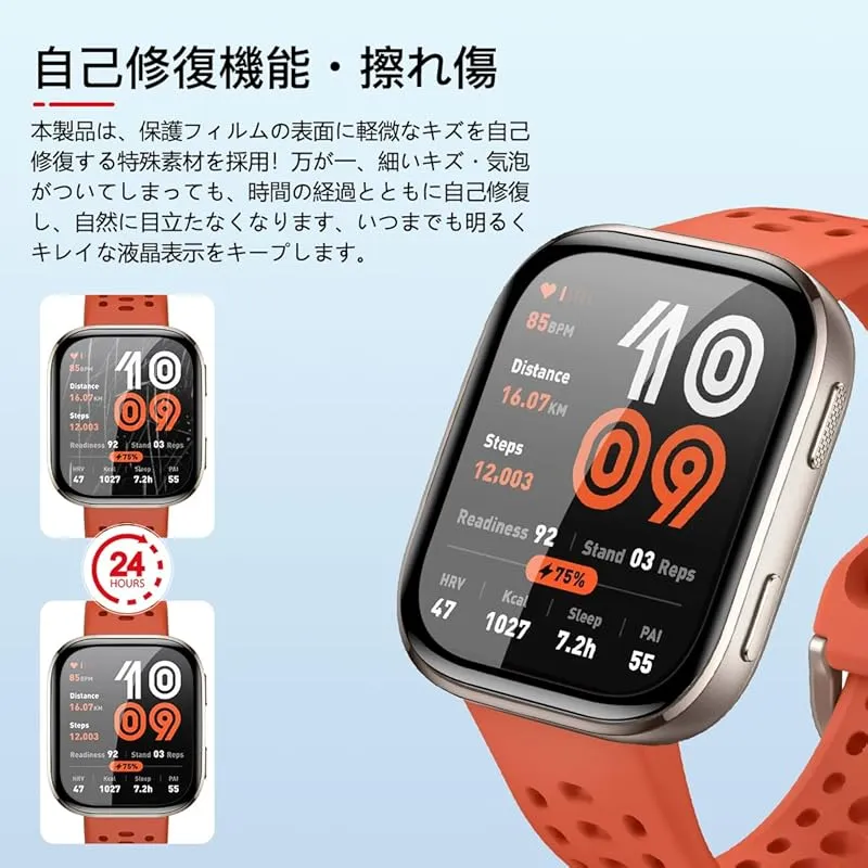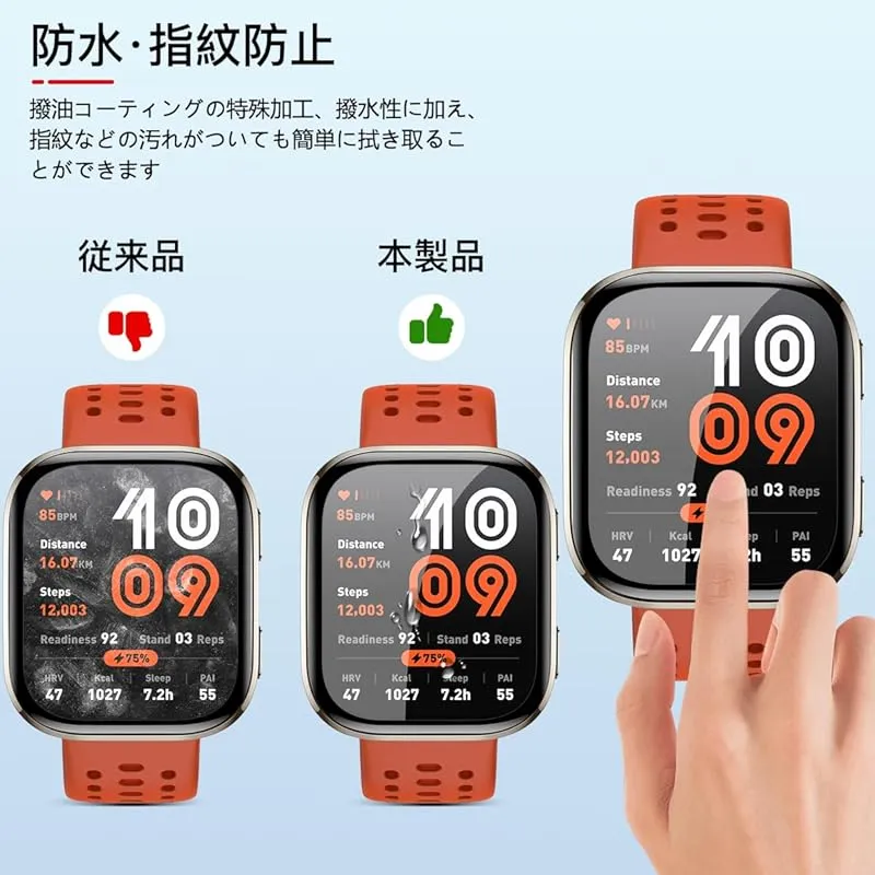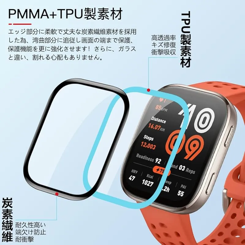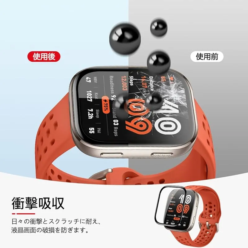 【商品説明】 対応機種:対応 Amazfit Bip 6 購入前に対応機種をご確認よろしくお願い致します パッケージ内容 3×全面保護フィルム 1x取扱説明書 1x気泡除去ヘラ 非常に柔らかいウレタン素材を採用する事により、湾曲部分に追従し画面の端まで保護することができ、Amazfit Bip6独自のデザインを損なわず、まるでフィルムを貼ってないような仕上がりになります。